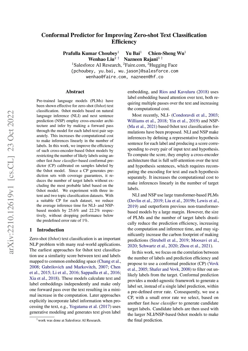 Pre-trained language models (PLMs) have been shown effective for zero-shot (0shot) text classification. 0shot models based on natural language inference (NLI) and next sentence prediction (NSP) employ cross-encoder architecture and infer by making a forward pass through the model for each label-text pair separately. This increases the computational cost to make inferences linearly in the number of labels. In this work, we improve the efficiency of such cross-encoder-based 0shot models by restricting the number of likely labels using another fast base classifier-based conformal predictor (CP) calibrated on samples labeled by the 0shot model. Since a CP generates prediction sets with coverage guarantees, it reduces the number of target labels without excluding the most probable label based on the 0shot model. We experiment with three intent and two topic classification datasets. With a suitable CP for each dataset, we reduce the average inference time for NLI- and NSP-based models by 25.6% and 22.2% respectively, without dropping performance below the predefined error rate of 1%.