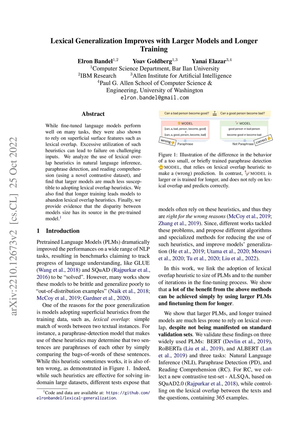 While fine-tuned language models perform well on many tasks, they were also shown to rely on superficial surface features such as lexical overlap. Excessive utilization of such heuristics can lead to failure on challenging inputs. We analyze the use of lexical overlap heuristics in natural language inference, paraphrase detection, and reading comprehension (using a novel contrastive dataset), and find that larger models are much less susceptible to adopting lexical overlap heuristics. We also find that longer training leads models to abandon lexical overlap heuristics. Finally, we provide evidence that the disparity between models size has its source in the pre-trained model
