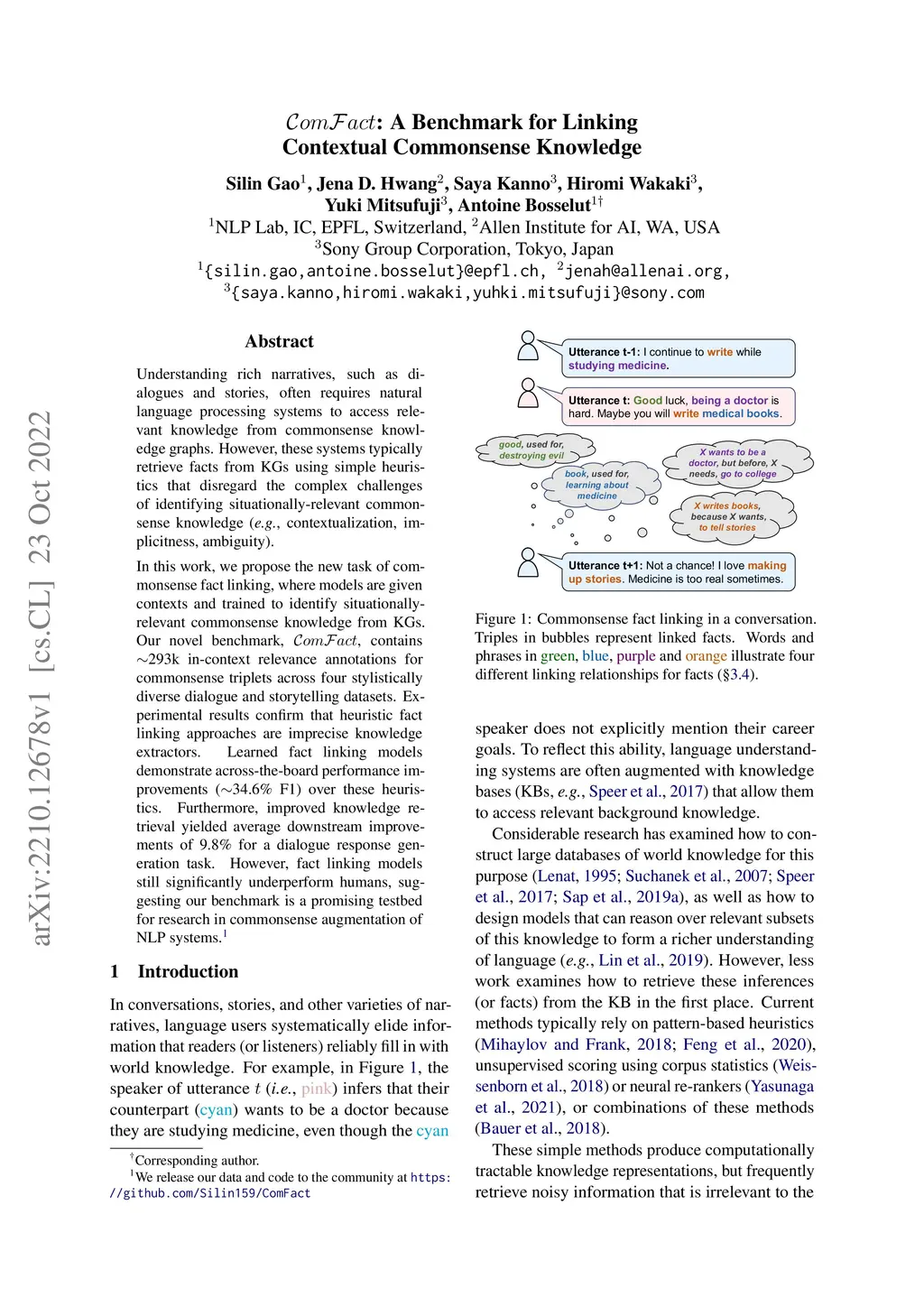 ComFact: A Benchmark for Linking Contextual Commonsense Knowledge