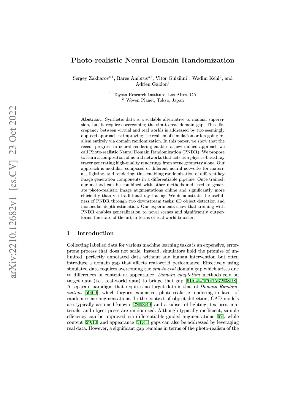 Synthetic data is a scalable alternative to manual supervision, but it requires overcoming the sim-to-real domain gap. This discrepancy between virtual and real worlds is addressed by two seemingly opposed approaches: improving the realism of simulation or foregoing realism entirely via domain randomization. In this paper, we show that the recent progress in neural rendering enables a new unified approach we call Photo-realistic Neural Domain Randomization (PNDR). We propose to learn a composition of neural networks that acts as a physics-based ray tracer generating high-quality renderings from scene geometry alone. Our approach is modular, composed of different neural networks for materials, lighting, and rendering, thus enabling randomization of different key image generation components in a differentiable pipeline. Once trained, our method can be combined with other methods and used to generate photo-realistic image augmentations online and significantly more efficiently than via traditional ray-tracing. We demonstrate the usefulness of PNDR through two downstream tasks: 6D object detection and monocular depth estimation. Our experiments show that training with PNDR enables generalization to novel scenes and significantly outperforms the state of the art in terms of real-world transfer.