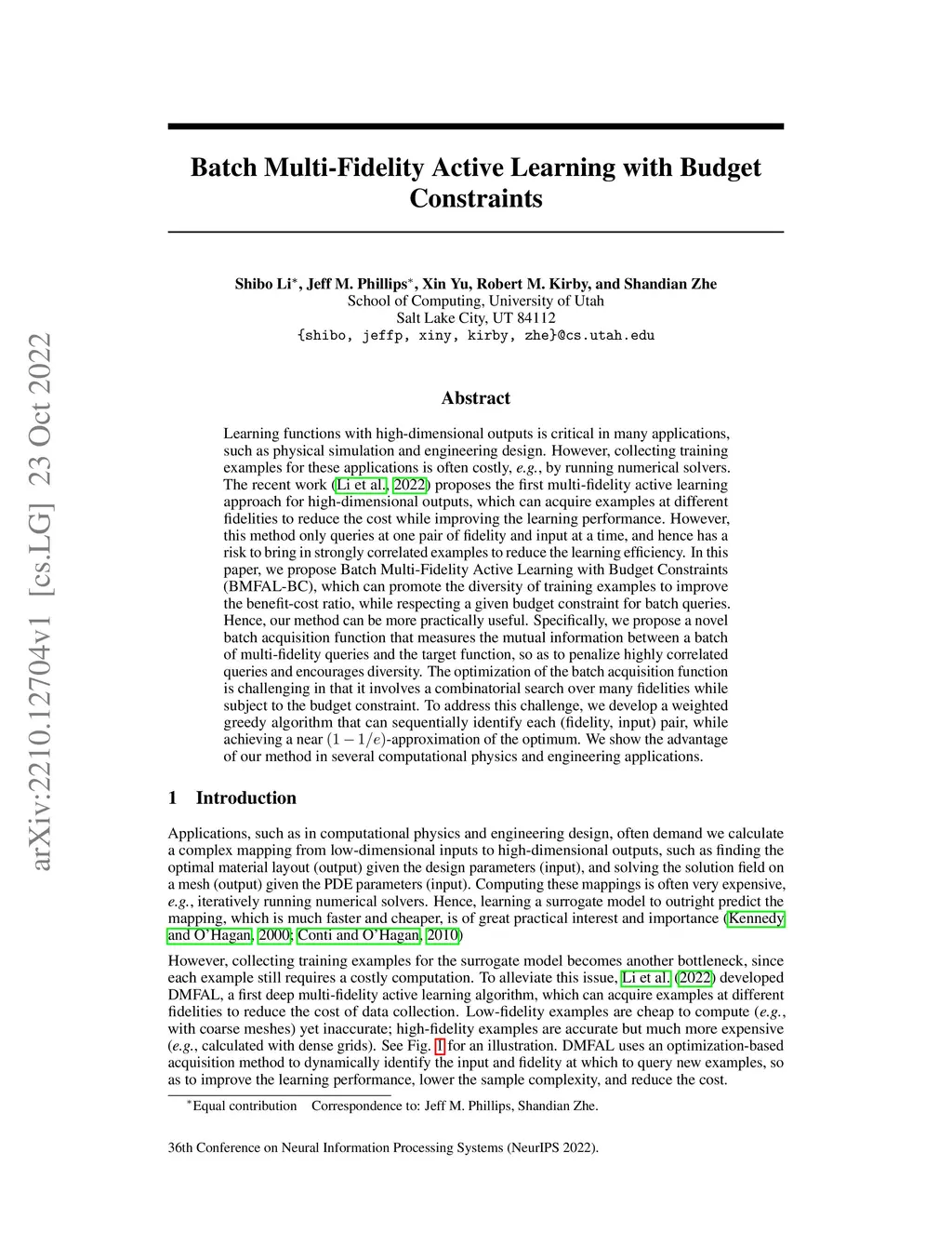 Learning functions with high-dimensional outputs is critical in many applications, such as physical simulation and engineering design. However, collecting training examples for these applications is often costly, e.g. by running numerical solvers. The recent work (Li et al., 2022) proposes the first multi-fidelity active learning approach for high-dimensional outputs, which can acquire examples at different fidelities to reduce the cost while improving the learning performance. However, this method only queries at one pair of fidelity and input at a time, and hence has a risk to bring in strongly correlated examples to reduce the learning efficiency. In this paper, we propose Batch Multi-Fidelity Active Learning with Budget Constraints (BMFAL-BC), which can promote the diversity of training examples to improve the benefit-cost ratio, while respecting a given budget constraint for batch queries. Hence, our method can be more practically useful. Specifically, we propose a novel batch acquisition function that measures the mutual information between a batch of multi-fidelity queries and the target function, so as to penalize highly correlated queries and encourages diversity. The optimization of the batch acquisition function is challenging in that it involves a combinatorial search over many fidelities while subject to the budget constraint. To address this challenge, we develop a weighted greedy algorithm that can sequentially identify each (fidelity, input) pair, while achieving a near -approximation of the optimum. We show the advantage of our method in several computational physics and engineering applications.