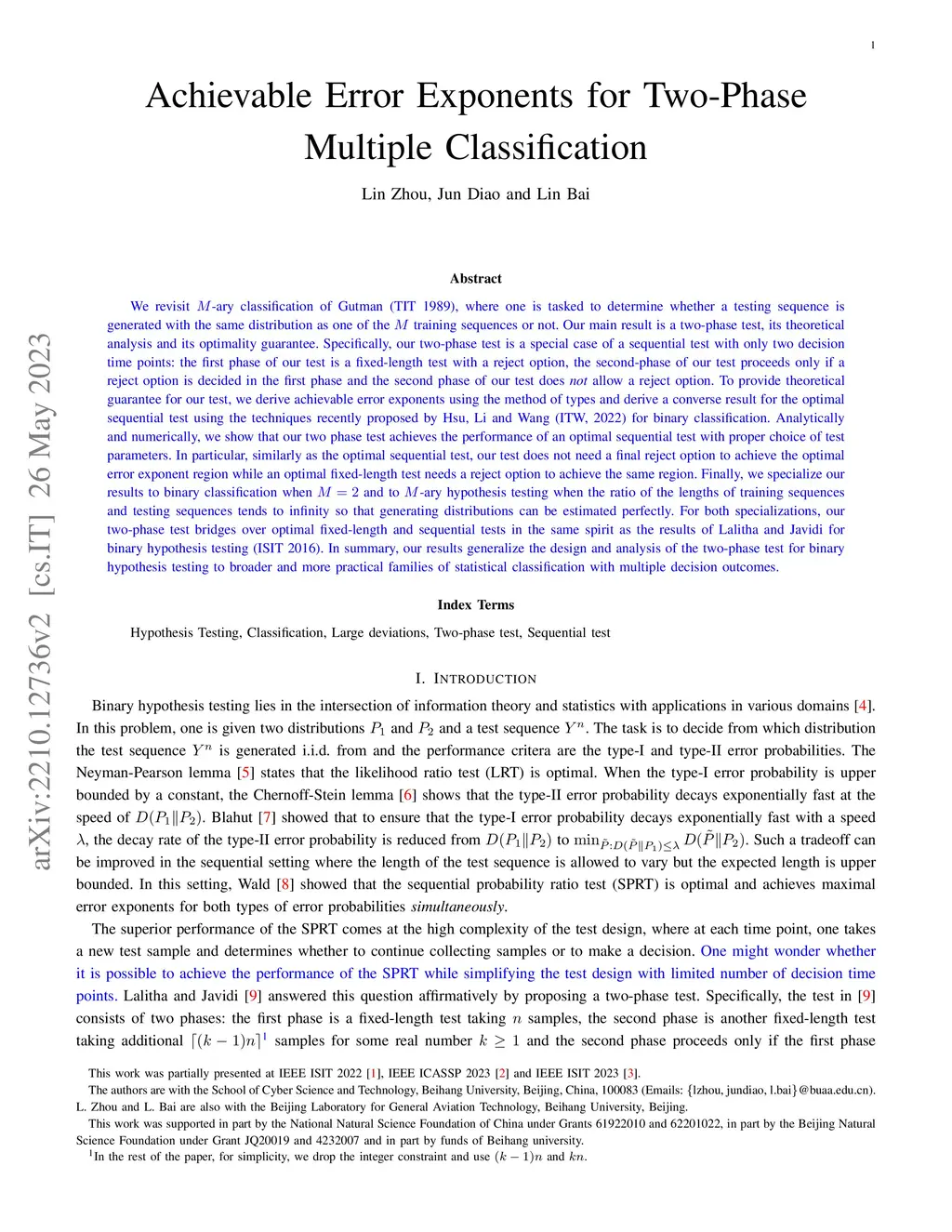 Achievable Error Exponents for Two-Phase Multiple Classification