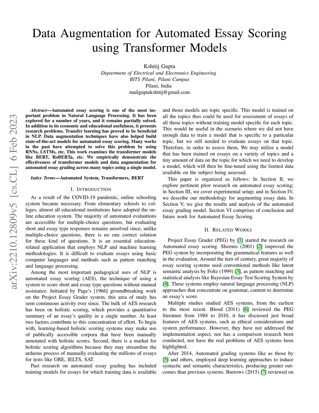 Data Augmentation for Automated Essay Scoring using Transformer Models