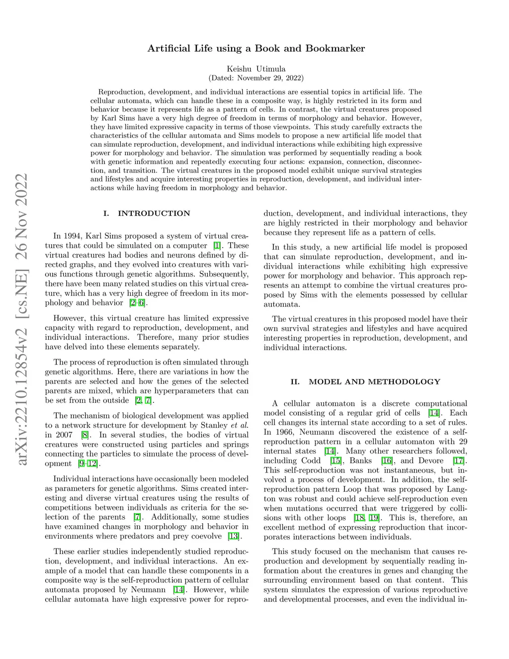 Reproduction, development, and individual interactions are essential topics in artificial life. The cellular automata, which can handle these in a composite way, is highly restricted in its form and behavior because it represents life as a pattern of cells. In contrast, the virtual creatures proposed by Karl Sims have a very high degree of freedom in terms of morphology and behavior. However, they have limited expressive capacity in terms of those viewpoints. This study carefully extracts the characteristics of the cellular automata and Sims models to propose a new artificial life model that can simulate reproduction, development, and individual interactions while exhibiting high expressive power for morphology and behavior. The simulation was performed by sequentially reading a book with genetic information and repeatedly executing four actions: expansion, connection, disconnection, and transition. The virtual creatures in the proposed model exhibit unique survival strategies and lifestyles and acquire interesting properties in reproduction, development, and individual interactions while having freedom in morphology and behavior.