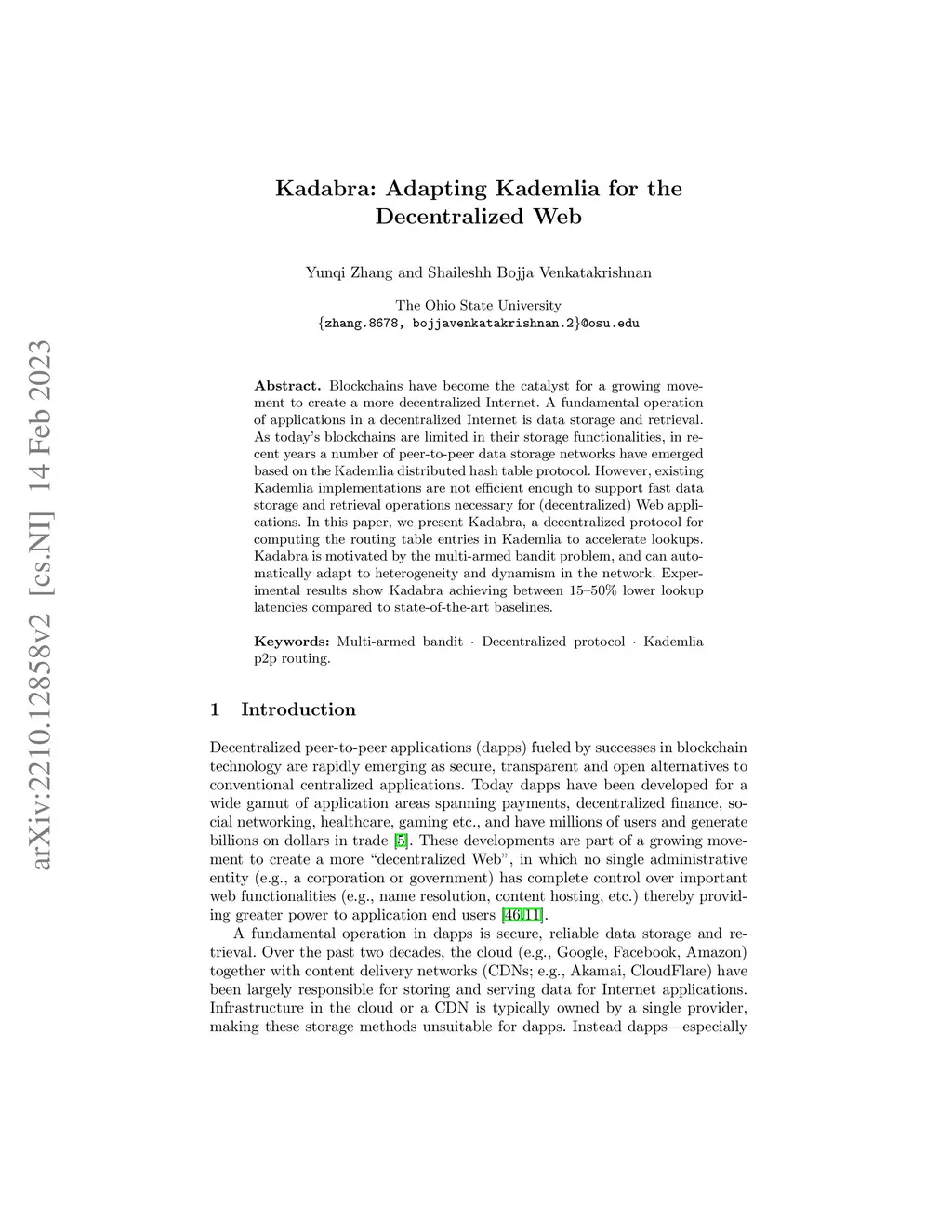 Blockchains have become the catalyst for a growing movement to create a more decentralized Internet. A fundamental operation of applications in a decentralized Internet is data storage and retrieval. As today's blockchains are limited in their storage functionalities, in recent years a number of peer-to-peer data storage networks have emerged based on the Kademlia distributed hash table protocol. However, existing Kademlia implementations are not efficient enough to support fast data storage and retrieval operations necessary for (decentralized) Web applications. In this paper, we present Kadabra, a decentralized protocol for computing the routing table entries in Kademlia to accelerate lookups. Kadabra is motivated by the multi-armed bandit problem, and can automatically adapt to heterogeneity and dynamism in the network. Experimental results show Kadabra achieving between 15-50% lower lookup latencies compared to state-of-the-art baselines.