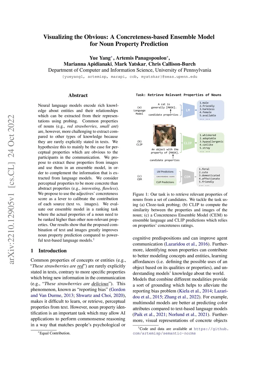 Neural language models encode rich knowledge about entities and their relationships which can be extracted from their representations using probing. Common properties of nouns (e.g., red strawberries, small ant) are, however, more challenging to extract compared to other types of knowledge because they are rarely explicitly stated in texts. We hypothesize this to mainly be the case for perceptual properties which are obvious to the participants in the communication. We propose to extract these properties from images and use them in an ensemble model, in order to complement the information that is extracted from language models. We consider perceptual properties to be more concrete than abstract properties (e.g., interesting, flawless). We propose to use the adjectives' concreteness score as a lever to calibrate the contribution of each source (text vs. images). We evaluate our ensemble model in a ranking task where the actual properties of a noun need to be ranked higher than other non-relevant properties. Our results show that the proposed combination of text and images greatly improves noun property prediction compared to powerful text-based language models.