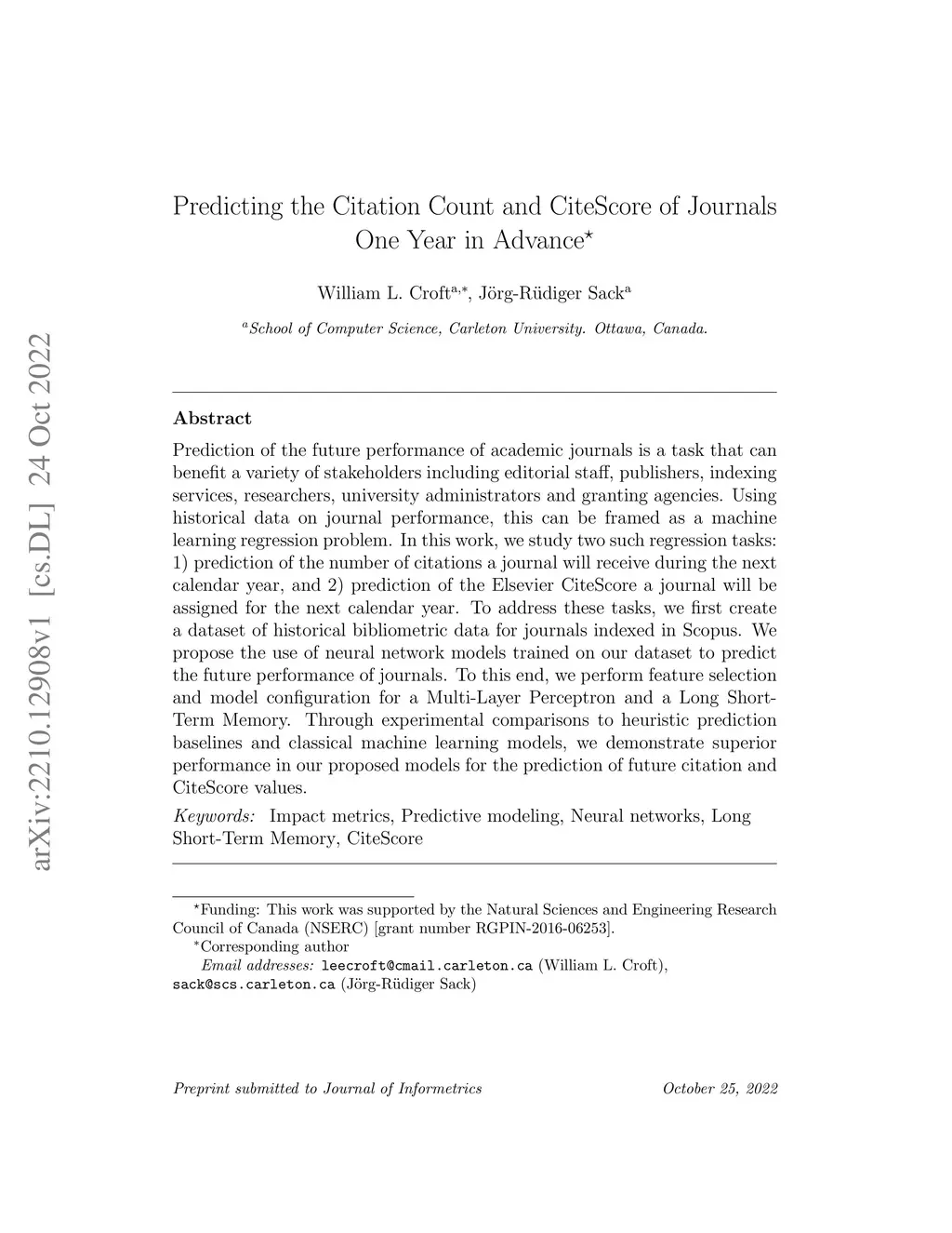 Prediction of the future performance of academic journals is a task that can benefit a variety of stakeholders including editorial staff, publishers, indexing services, researchers, university administrators and granting agencies. Using historical data on journal performance, this can be framed as a machine learning regression problem. In this work, we study two such regression tasks: 1) prediction of the number of citations a journal will receive during the next calendar year, and 2) prediction of the Elsevier CiteScore a journal will be assigned for the next calendar year. To address these tasks, we first create a dataset of historical bibliometric data for journals indexed in Scopus. We propose the use of neural network models trained on our dataset to predict the future performance of journals. To this end, we perform feature selection and model configuration for a Multi-Layer Perceptron and a Long Short-Term Memory. Through experimental comparisons to heuristic prediction baselines and classical machine learning models, we demonstrate superior performance in our proposed models for the prediction of future citation and CiteScore values.