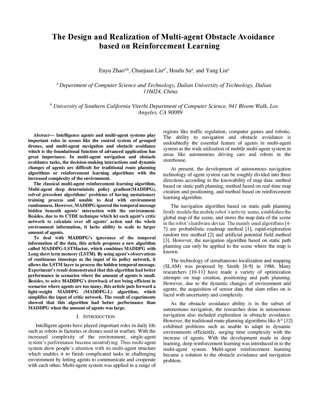 Intelligence agents and multi-agent systems play important roles in scenes like the control system of grouped drones, and multi-agent navigation and obstacle avoidance which is the foundational function of advanced application has great importance. In multi-agent navigation and obstacle avoidance tasks, the decision-making interactions and dynamic changes of agents are difficult for traditional route planning algorithms or reinforcement learning algorithms with the increased complexity of the environment. The classical multi-agent reinforcement learning algorithm, Multi-agent deep deterministic policy gradient(MADDPG), solved precedent algorithms' problems of having unstationary training process and unable to deal with environment randomness. However, MADDPG ignored the temporal message hidden beneath agents' interaction with the environment. Besides, due to its CTDE technique which let each agent's critic network to calculate over all agents' action and the whole environment information, it lacks ability to scale to larger amount of agents. To deal with MADDPG's ignorance of the temporal information of the data, this article proposes a new algorithm called MADDPG-LSTMactor, which combines MADDPG with Long short term memory (LSTM). By using agent's observations of continuous timesteps as the input of its policy network, it allows the LSTM layer to process the hidden temporal message. Experimental result demonstrated that this algorithm had better performance in scenarios where the amount of agents is small. Besides, to solve MADDPG's drawback of not being efficient in scenarios where agents are too many, this article puts forward a light-weight MADDPG (MADDPG-L) algorithm, which simplifies the input of critic network. The result of experiments showed that this algorithm had better performance than MADDPG when the amount of agents was large.