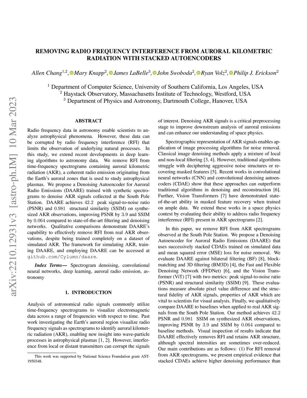 Radio frequency data in astronomy enable scientists to analyze astrophysical phenomena. However, these data can be corrupted by radio frequency interference (RFI) that limits the observation of underlying natural processes. In this study, we extend recent developments in deep learning algorithms to astronomy data. We remove RFI from time-frequency spectrograms containing auroral kilometric radiation (AKR), a coherent radio emission originating from the Earth's auroral zones that is used to study astrophysical plasmas. We propose a Denoising Autoencoder for Auroral Radio Emissions (DAARE) trained with synthetic spectrograms to denoise AKR signals collected at the South Pole Station. DAARE achieves 42.2 peak signal-to-noise ratio (PSNR) and 0.981 structural similarity (SSIM) on synthesized AKR observations, improving PSNR by 3.9 and SSIM by 0.064 compared to state-of-the-art filtering and denoising networks. Qualitative comparisons demonstrate DAARE's capability to effectively remove RFI from real AKR observations, despite being trained completely on a dataset of simulated AKR. The framework for simulating AKR, training DAARE, and employing DAARE can be accessed at github.com/Cylumn/daare.