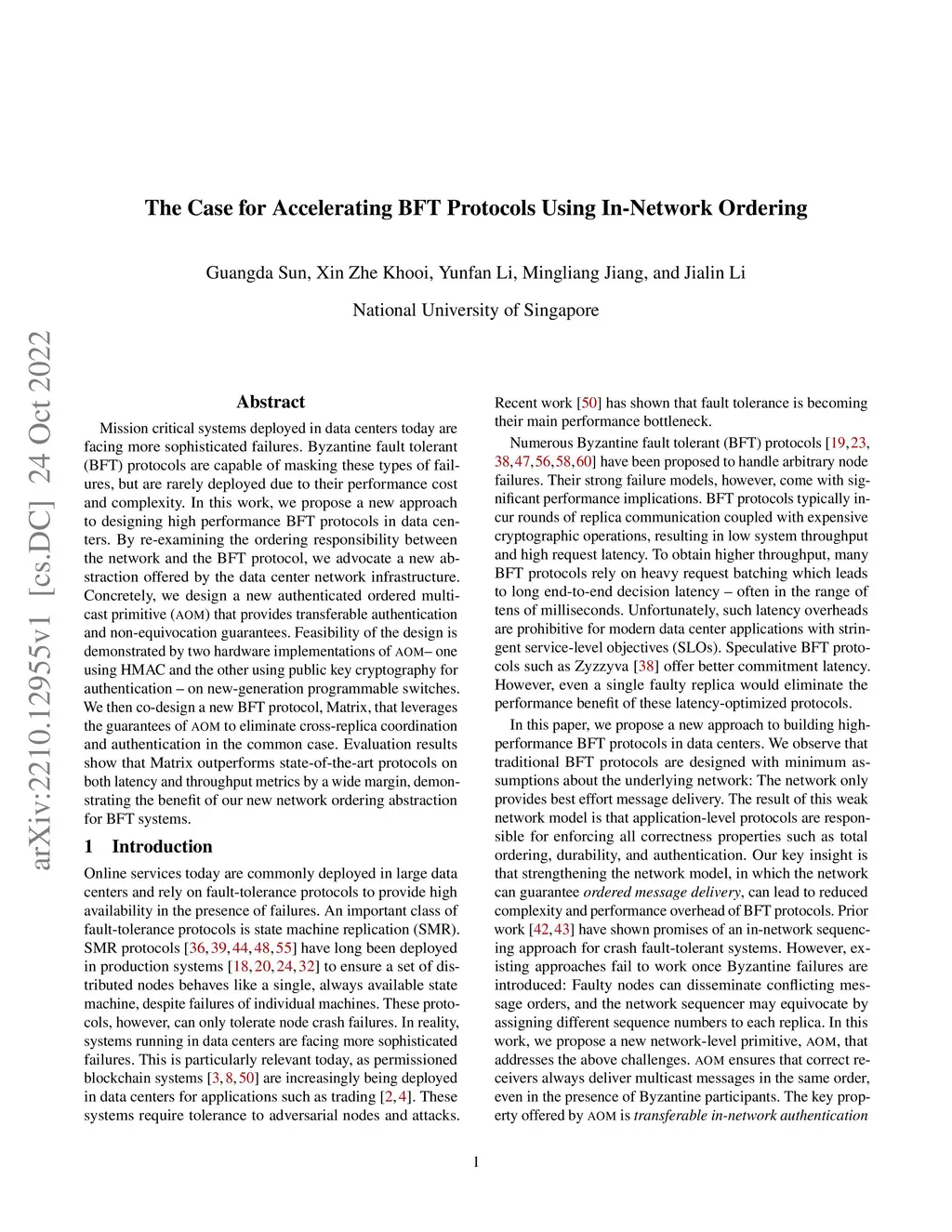 Mission critical systems deployed in data centers today are facing more sophisticated failures. Byzantine fault tolerant (BFT) protocols are capable of masking these types of failures, but are rarely deployed due to their performance cost and complexity. In this work, we propose a new approach to designing high performance BFT protocols in data centers. By re-examining the ordering responsibility between the network and the BFT protocol, we advocate a new abstraction offered by the data center network infrastructure. Concretely, we design a new authenticated ordered multicast primitive (AOM) that provides transferable authentication and non-equivocation guarantees. Feasibility of the design is demonstrated by two hardware implementations of AOM -- one using HMAC and the other using public key cryptography for authentication -- on new-generation programmable switches. We then co-design a new BFT protocol, Matrix, that leverages the guarantees of AOM to eliminate cross-replica coordination and authentication in the common case. Evaluation results show that Matrix outperforms state-of-the-art protocols on both latency and throughput metrics by a wide margin, demonstrating the benefit of our new network ordering abstraction for BFT systems.