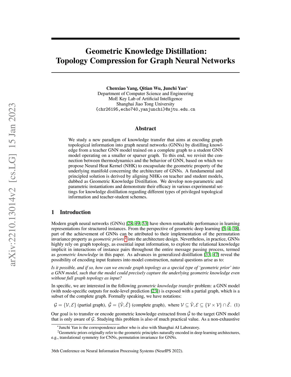 We study a new paradigm of knowledge transfer that aims at encoding graph topological information into graph neural networks (GNNs) by distilling knowledge from a teacher GNN model trained on a complete graph to a student GNN model operating on a smaller or sparser graph. To this end, we revisit the connection between thermodynamics and the behavior of GNN, based on which we propose Neural Heat Kernel (NHK) to encapsulate the geometric property of the underlying manifold concerning the architecture of GNNs. A fundamental and principled solution is derived by aligning NHKs on teacher and student models, dubbed as Geometric Knowledge Distillation. We develop non- and parametric instantiations and demonstrate their efficacy in various experimental settings for knowledge distillation regarding different types of privileged topological information and teacher-student schemes.