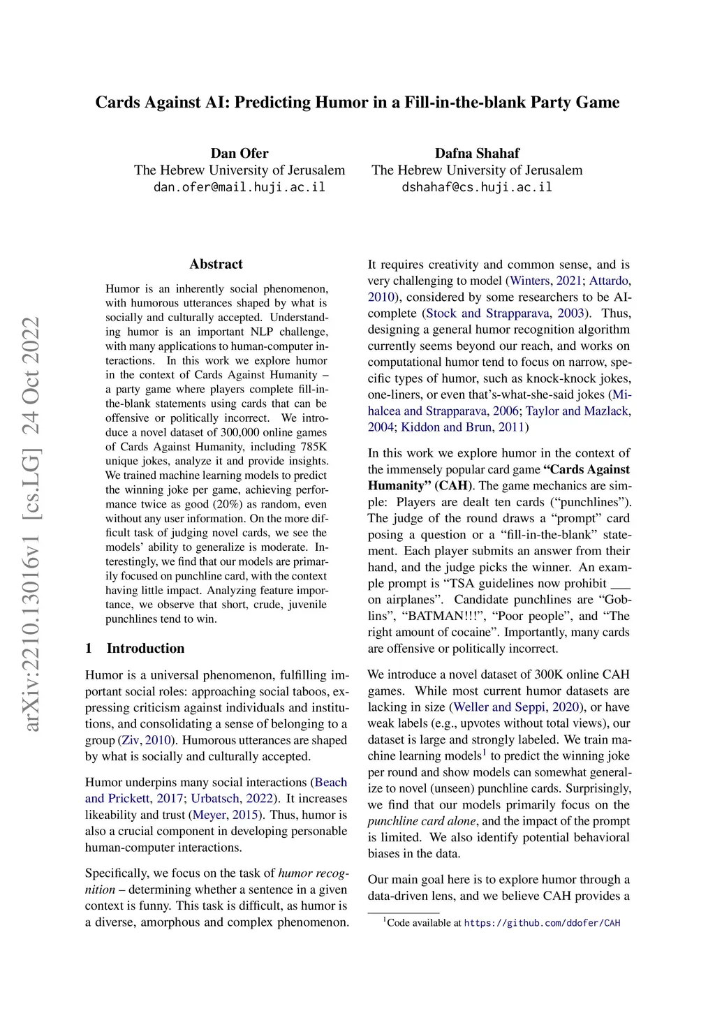 Humor is an inherently social phenomenon, with humorous utterances shaped by what is socially and culturally accepted. Understanding humor is an important NLP challenge, with many applications to human-computer interactions. In this work we explore humor in the context of Cards Against Humanity -- a party game where players complete fill-in-the-blank statements using cards that can be offensive or politically incorrect. We introduce a novel dataset of 300,000 online games of Cards Against Humanity, including 785K unique jokes, analyze it and provide insights. We trained machine learning models to predict the winning joke per game, achieving performance twice as good (20\%) as random, even without any user information. On the more difficult task of judging novel cards, we see the models' ability to generalize is moderate. Interestingly, we find that our models are primarily focused on punchline card, with the context having little impact. Analyzing feature importance, we observe that short, crude, juvenile punchlines tend to win.