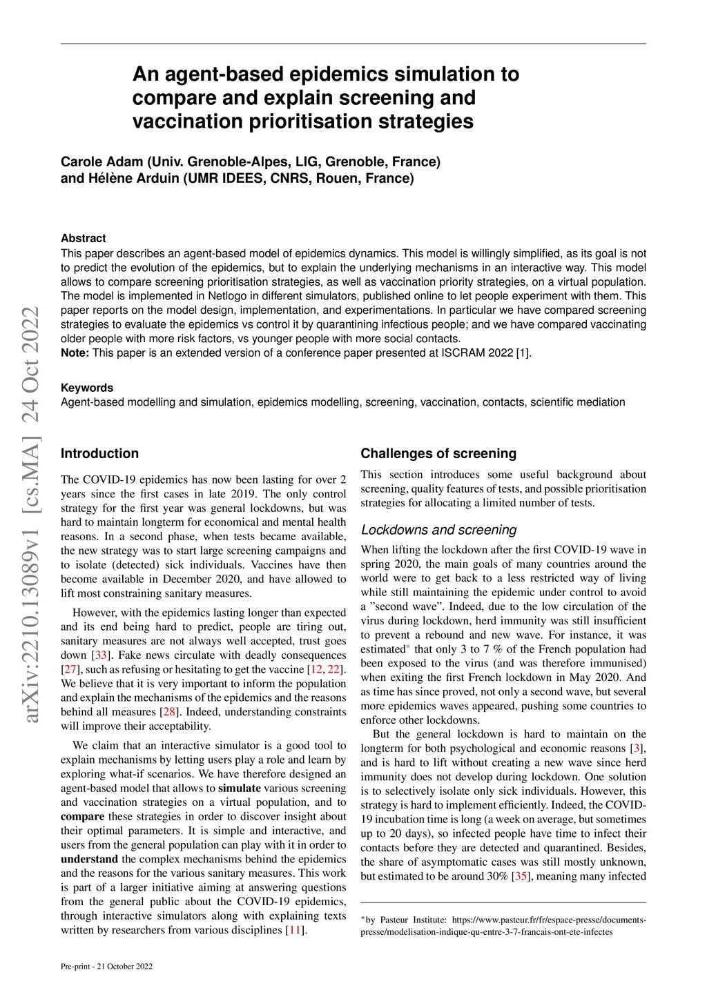 This paper describes an agent-based model of epidemics dynamics. This model is willingly simplified, as its goal is not to predict the evolution of the epidemics, but to explain the underlying mechanisms in an interactive way. This model allows to compare screening prioritisation strategies, as well as vaccination priority strategies, on a virtual population. The model is implemented in Netlogo in different simulators, published online to let people experiment with them. This paper reports on the model design, implementation, and experimentations. In particular we have compared screening strategies to evaluate the epidemics vs control it by quarantining infectious people; and we have compared vaccinating older people with more risk factors, vs younger people with more social contacts.