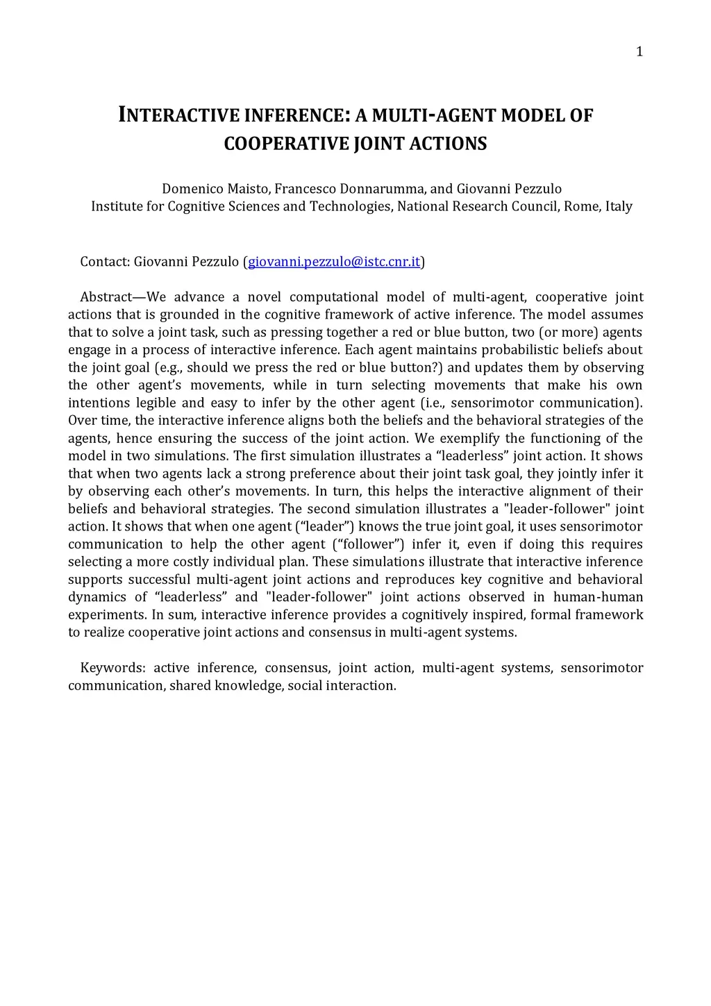 We advance a novel computational model of multi-agent, cooperative joint actions that is grounded in the cognitive framework of active inference. The model assumes that to solve a joint task, such as pressing together a red or blue button, two (or more) agents engage in a process of interactive inference. Each agent maintains probabilistic beliefs about the goal of the joint task (e.g., should we press the red or blue button?) and updates them by observing the other agent's movements, while in turn selecting movements that make his own intentions legible and easy to infer by the other agent (i.e., sensorimotor communication). Over time, the interactive inference aligns both the beliefs and the behavioral strategies of the agents, hence ensuring the success of the joint action. We exemplify the functioning of the model in two simulations. The first simulation illustrates a ''leaderless'' joint action. It shows that when two agents lack a strong preference about their joint task goal, they jointly infer it by observing each other's movements. In turn, this helps the interactive alignment of their beliefs and behavioral strategies. The second simulation illustrates a "leader-follower" joint action. It shows that when one agent ("leader") knows the true joint goal, it uses sensorimotor communication to help the other agent ("follower") infer it, even if doing this requires selecting a more costly individual plan. These simulations illustrate that interactive inference supports successful multi-agent joint actions and reproduces key cognitive and behavioral dynamics of "leaderless" and "leader-follower" joint actions observed in human-human experiments. In sum, interactive inference provides a cognitively inspired, formal framework to realize cooperative joint actions and consensus in multi-agent systems.