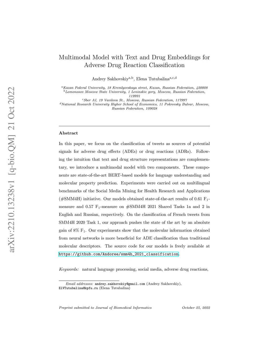 In this paper, we focus on the classification of tweets as sources of potential signals for adverse drug effects (ADEs) or drug reactions (ADRs). Following the intuition that text and drug structure representations are complementary, we introduce a multimodal model with two components. These components are state-of-the-art BERT-based models for language understanding and molecular property prediction. Experiments were carried out on multilingual benchmarks of the Social Media Mining for Health Research and Applications (#SMM4H) initiative. Our models obtained state-of-the-art results of 0.61 F1 and 0.57 F1 on #SMM4H 2021 Shared Tasks 1a and 2 in English and Russian, respectively. On the classification of French tweets from SMM4H 2020 Task 1, our approach pushes the state of the art by an absolute gain of 8% F1. Our experiments show that the molecular information obtained from neural networks is more beneficial for ADE classification than traditional molecular descriptors. The source code for our models is freely available at https://github.com/Andoree/smm4h_2021_classification.