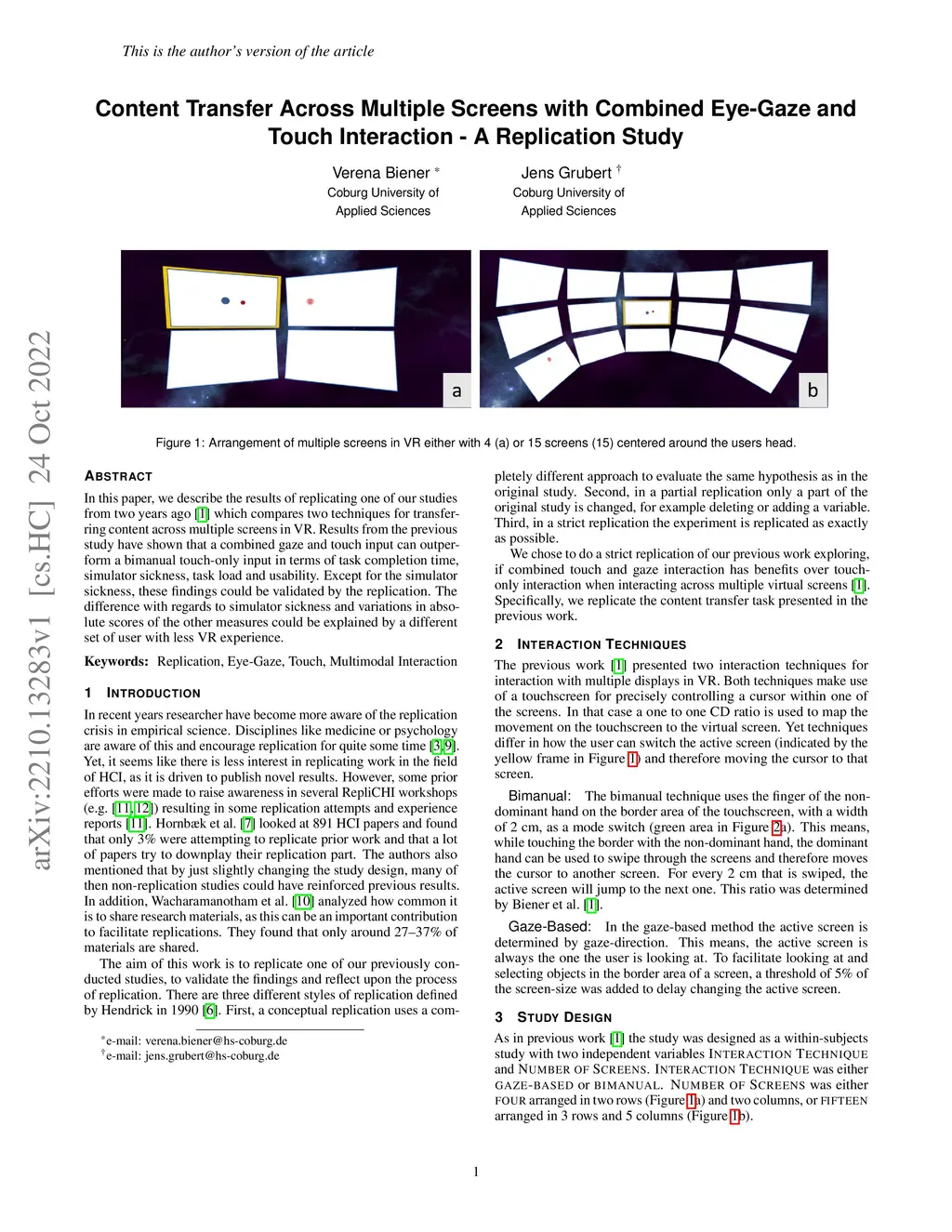 In this paper, we describe the results of replicating one of our studies from two years ago which compares two techniques for transferring content across multiple screens in VR. Results from the previous study have shown that a combined gaze and touch input can outperform a bimanual touch-only input in terms of task completion time, simulator sickness, task load and usability. Except for the simulator sickness, these findings could be validated by the replication. The difference with regards to simulator sickness and variations in absolute scores of the other measures could be explained by a different set of user with less VR experience.