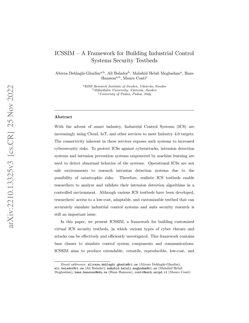 With the advent of smart industry, Industrial Control Systems (ICS) are increasingly using Cloud, IoT, and other services to meet Industry 4.0 targets. The connectivity inherent in these services exposes such systems to increased cybersecurity risks. To protect ICSs against cyberattacks, intrusion detection systems and intrusion prevention systems empowered by machine learning are used to detect abnormal behavior of the systems. Operational ICSs are not safe environments to research intrusion detection systems due to the possibility of catastrophic risks. Therefore, realistic ICS testbeds enable researchers to analyze and validate their intrusion detection algorithms in a controlled environment. Although various ICS testbeds have been developed, researchers' access to a low-cost, adaptable, and customizable testbed that can accurately simulate industrial control systems and suits security research is still an important issue. In this paper, we present ICSSIM, a framework for building customized virtual ICS security testbeds, in which various types of cyber threats and attacks can be effectively and efficiently investigated. This framework contains base classes to simulate control system components and communications. ICSSIM aims to produce extendable, versatile, reproducible, low-cost, and comprehensive ICS testbeds with realistic details and high fidelity. ICSSIM is built on top of the Docker container technology, which provides realistic network emulation and runs ICS components on isolated private operating system kernels. ICSSIM reduces the time for developing ICS components and offers physical process modelling using software and hardware in the loop simulation. We demonstrated ICSSIM by creating a testbed and validating its functionality by showing how different cyberattacks can be applied.
