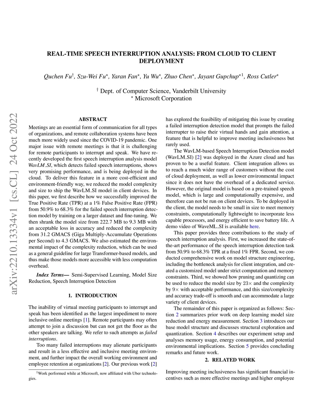 Meetings are an essential form of communication for all types of organizations, and remote collaboration systems have been much more widely used since the COVID-19 pandemic. One major issue with remote meetings is that it is challenging for remote participants to interrupt and speak. We have recently developed the first speech interruption analysis model, which detects failed speech interruptions, shows very promising performance, and is being deployed in the cloud. To deliver this feature in a more cost-efficient and environment-friendly way, we reduced the model complexity and size to ship the WavLM_SI model in client devices. In this paper, we first describe how we successfully improved the True Positive Rate (TPR) at a 1% False Positive Rate (FPR) from 50.9% to 68.3% for the failed speech interruption detection model by training on a larger dataset and fine-tuning. We then shrank the model size from 222.7 MB to 9.3 MB with an acceptable loss in accuracy and reduced the complexity from 31.2 GMACS (Giga Multiply-Accumulate Operations per Second) to 4.3 GMACS. We also estimated the environmental impact of the complexity reduction, which can be used as a general guideline for large Transformer-based models, and thus make those models more accessible with less computation overhead.