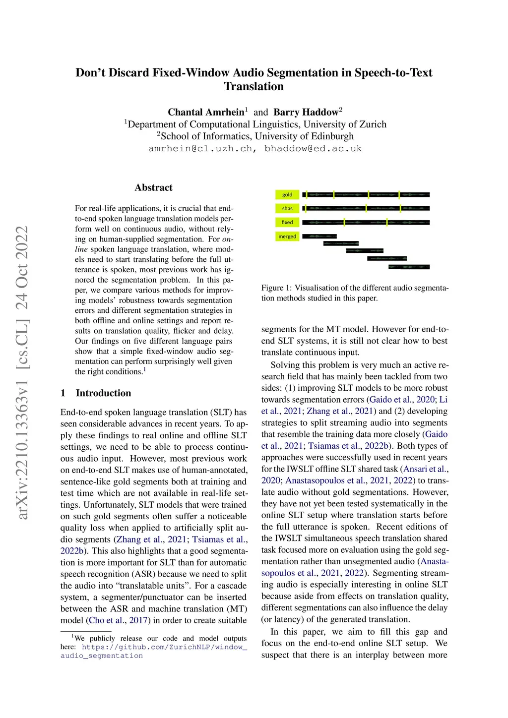 For real-life applications, it is crucial that end-to-end spoken language translation models perform well on continuous audio, without relying on human-supplied segmentation. For online spoken language translation, where models need to start translating before the full utterance is spoken, most previous work has ignored the segmentation problem. In this paper, we compare various methods for improving models' robustness towards segmentation errors and different segmentation strategies in both offline and online settings and report results on translation quality, flicker and delay. Our findings on five different language pairs show that a simple fixed-window audio segmentation can perform surprisingly well given the right conditions.