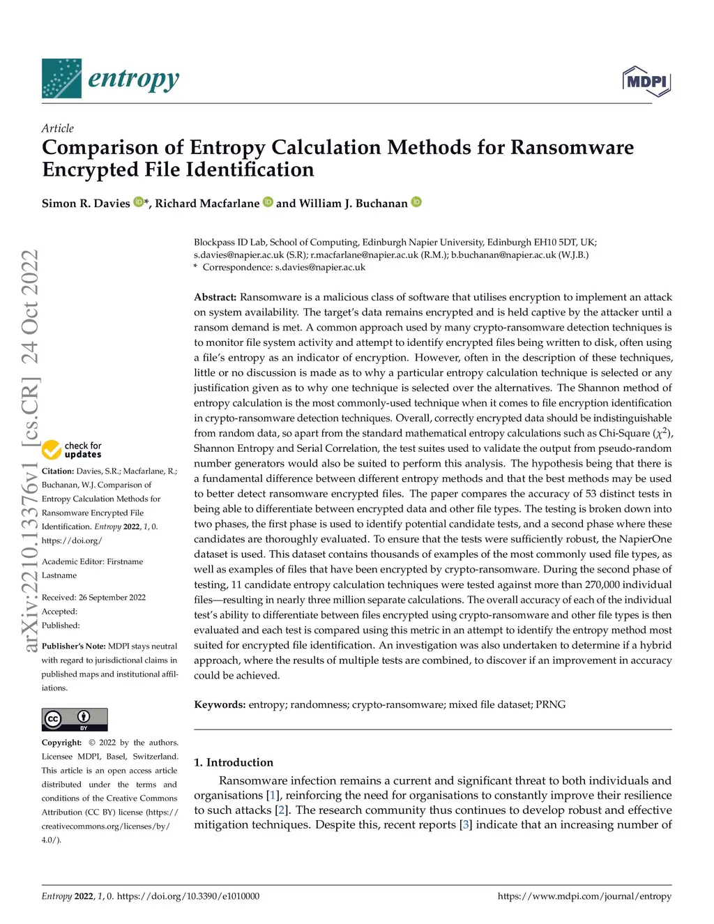 Ransomware is a malicious class of software that utilises encryption to implement an attack on system availability. The target's data remains encrypted and is held captive by the attacker until a ransom demand is met. A common approach used by many crypto-ransomware detection techniques is to monitor file system activity and attempt to identify encrypted files being written to disk, often using a file's entropy as an indicator of encryption. However, often in the description of these techniques, little or no discussion is made as to why a particular entropy calculation technique is selected or any justification given as to why one technique is selected over the alternatives. The Shannon method of entropy calculation is the most commonly-used technique when it comes to file encryption identification in crypto-ransomware detection techniques. Overall, correctly encrypted data should be indistinguishable from random data, so apart from the standard mathematical entropy calculations such as Chi-Square, Shannon Entropy and Serial Correlation, the test suites used to validate the output from pseudo-random number generators would also be suited to perform this analysis. he hypothesis being that there is a fundamental difference between different entropy methods and that the best methods may be used to better detect ransomware encrypted files. The paper compares the accuracy of 53 distinct tests in being able to differentiate between encrypted data and other file types. The testing is broken down into two phases, the first phase is used to identify potential candidate tests, and a second phase where these candidates are thoroughly evaluated. To ensure that the tests were sufficiently robust, the NapierOne dataset is used. This dataset contains thousands of examples of the most commonly used file types, as well as examples of files that have been encrypted by crypto-ransomware.