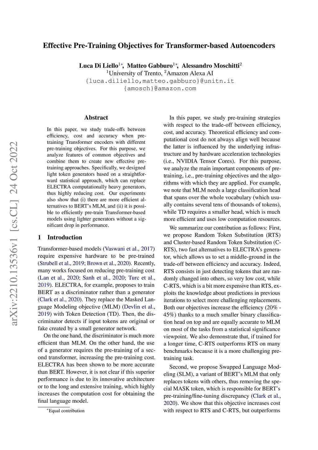 In this paper, we study trade-offs between efficiency, cost and accuracy when pre-training Transformer encoders with different pre-training objectives. For this purpose, we analyze features of common objectives and combine them to create new effective pre-training approaches. Specifically, we designed light token generators based on a straightforward statistical approach, which can replace ELECTRA computationally heavy generators, thus highly reducing cost. Our experiments also show that (i) there are more efficient alternatives to BERT's MLM, and (ii) it is possible to efficiently pre-train Transformer-based models using lighter generators without a significant drop in performance.