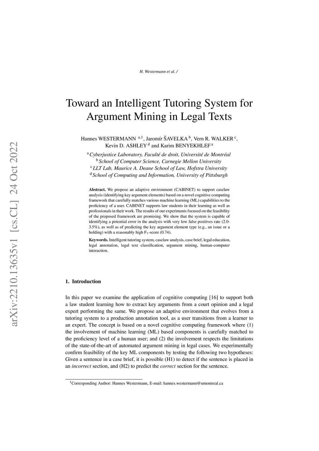 We propose an adaptive environment (CABINET) to support caselaw analysis (identifying key argument elements) based on a novel cognitive computing framework that carefully matches various machine learning (ML) capabilities to the proficiency of a user. CABINET supports law students in their learning as well as professionals in their work. The results of our experiments focused on the feasibility of the proposed framework are promising. We show that the system is capable of identifying a potential error in the analysis with very low false positives rate (2.0-3.5%), as well as of predicting the key argument element type (e.g., an issue or a holding) with a reasonably high F1-score (0.74).