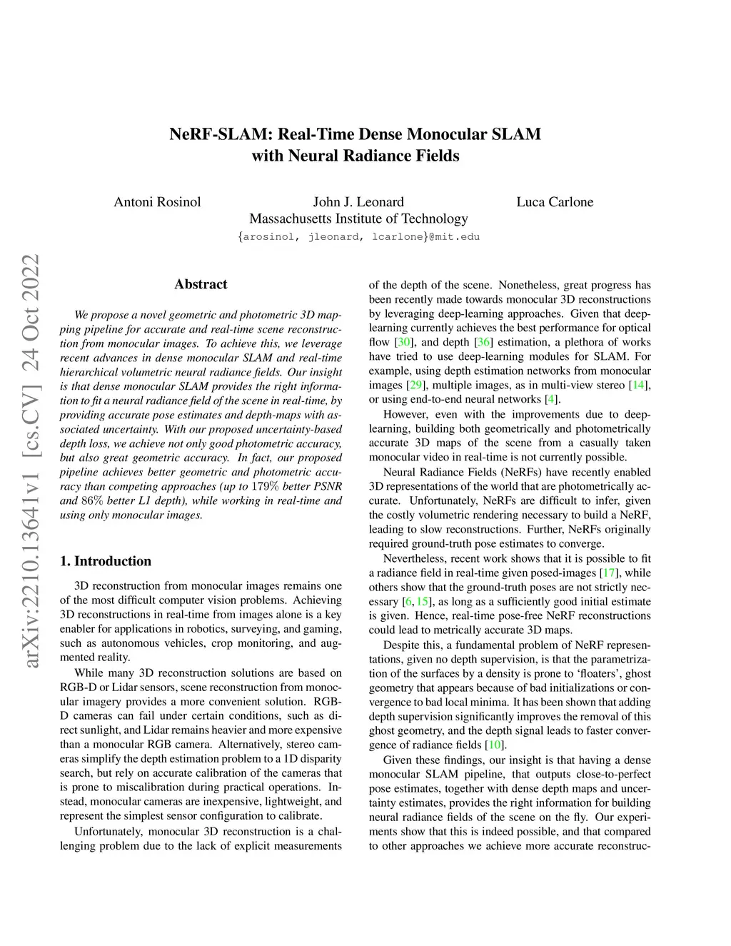 We propose a novel geometric and photometric 3D mapping pipeline for accurate and real-time scene reconstruction from monocular images. To achieve this, we leverage recent advances in dense monocular SLAM and real-time hierarchical volumetric neural radiance fields. Our insight is that dense monocular SLAM provides the right information to fit a neural radiance field of the scene in real-time, by providing accurate pose estimates and depth-maps with associated uncertainty. With our proposed uncertainty-based depth loss, we achieve not only good photometric accuracy, but also great geometric accuracy. In fact, our proposed pipeline achieves better geometric and photometric accuracy than competing approaches (up to 179% better PSNR and 86% better L1 depth), while working in real-time and using only monocular images.