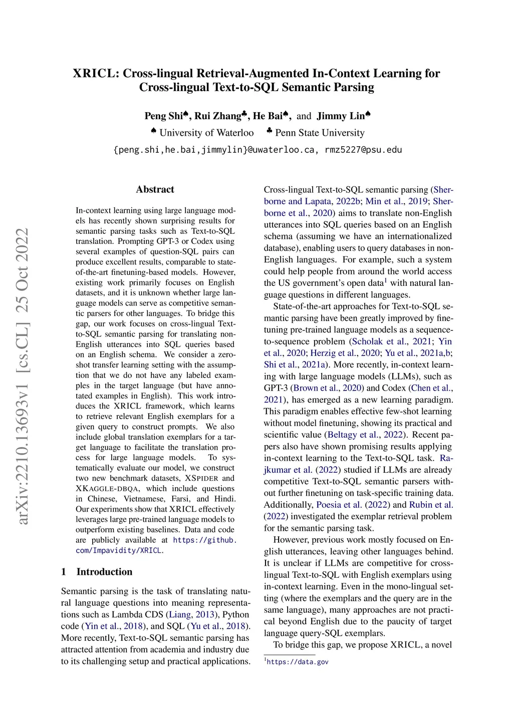 In-context learning using large language models has recently shown surprising results for semantic parsing tasks such as Text-to-SQL translation. Prompting GPT-3 or Codex using several examples of question-SQL pairs can produce excellent results, comparable to state-of-the-art finetuning-based models. However, existing work primarily focuses on English datasets, and it is unknown whether large language models can serve as competitive semantic parsers for other languages. To bridge this gap, our work focuses on cross-lingual Text-to-SQL semantic parsing for translating non-English utterances into SQL queries based on an English schema. We consider a zero-shot transfer learning setting with the assumption that we do not have any labeled examples in the target language (but have annotated examples in English). This work introduces the XRICL framework, which learns to retrieve relevant English exemplars for a given query to construct prompts. We also include global translation exemplars for a target language to facilitate the translation process for large language models. To systematically evaluate our model, we construct two new benchmark datasets, XSpider and XKaggle-dbqa, which include questions in Chinese, Vietnamese, Farsi, and Hindi. Our experiments show that XRICL effectively leverages large pre-trained language models to outperform existing baselines. Data and code are publicly available at https://github.com/Impavidity/XRICL.