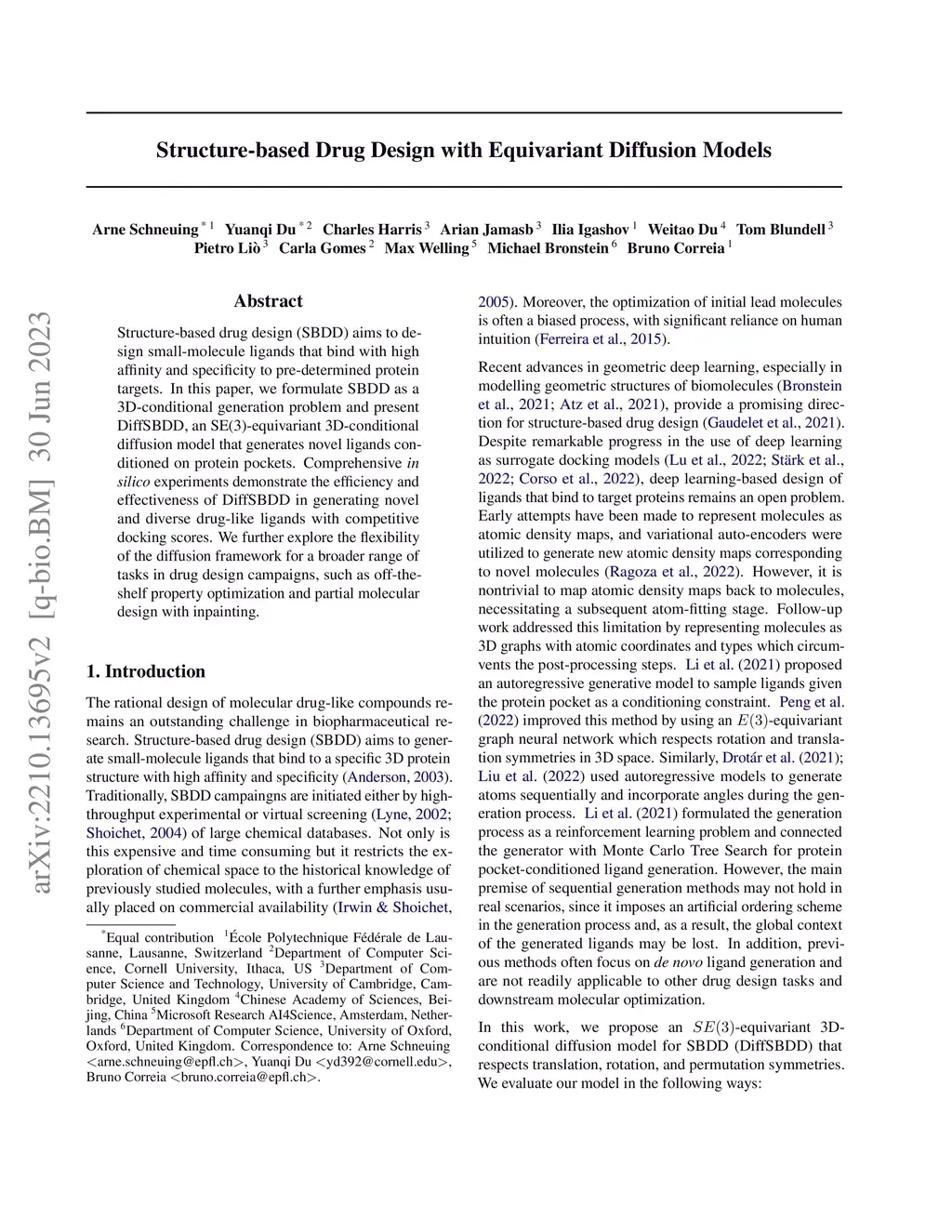 Structure-based drug design (SBDD) aims to design small-molecule ligands that bind with high affinity and specificity to pre-determined protein targets. In this paper, we formulate SBDD as a 3D-conditional generation problem and present DiffSBDD, an SE(3)-equivariant 3D-conditional diffusion model that generates novel ligands conditioned on protein pockets. Comprehensive in silico experiments demonstrate the efficiency and effectiveness of DiffSBDD in generating novel and diverse drug-like ligands with competitive docking scores. We further explore the flexibility of the diffusion framework for a broader range of tasks in drug design campaigns, such as off-the-shelf property optimization and partial molecular design with inpainting.