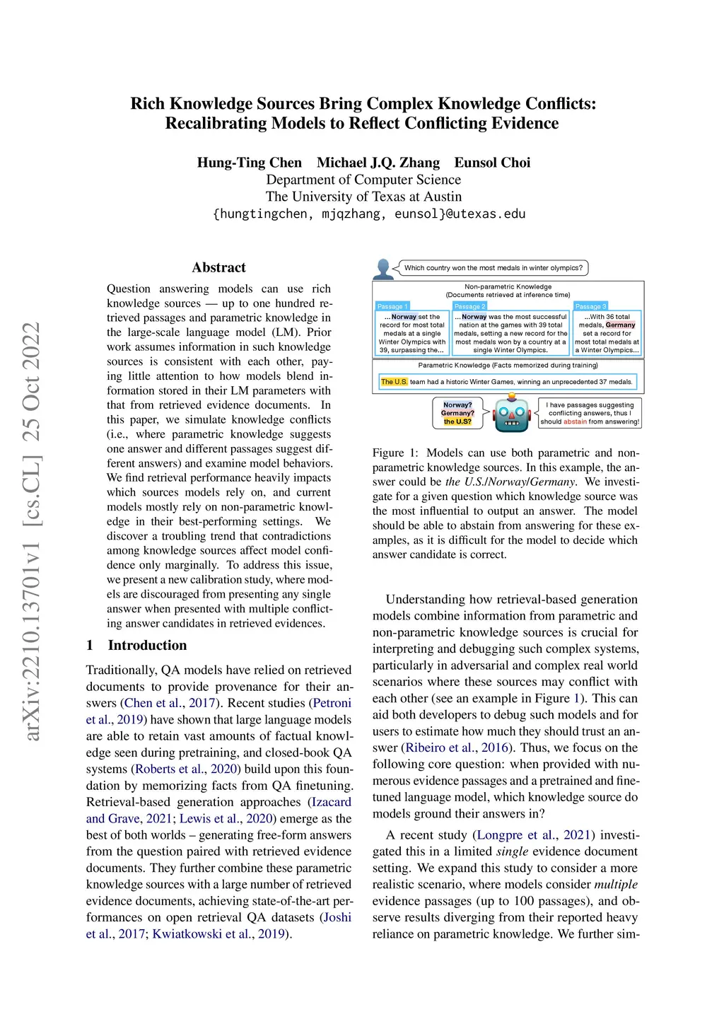 Question answering models can use rich knowledge sources -- up to one hundred retrieved passages and parametric knowledge in the large-scale language model (LM). Prior work assumes information in such knowledge sources is consistent with each other, paying little attention to how models blend information stored in their LM parameters with that from retrieved evidence documents. In this paper, we simulate knowledge conflicts (i.e., where parametric knowledge suggests one answer and different passages suggest different answers) and examine model behaviors. We find retrieval performance heavily impacts which sources models rely on, and current models mostly rely on non-parametric knowledge in their best-performing settings. We discover a troubling trend that contradictions among knowledge sources affect model confidence only marginally. To address this issue, we present a new calibration study, where models are discouraged from presenting any single answer when presented with multiple conflicting answer candidates in retrieved evidences.