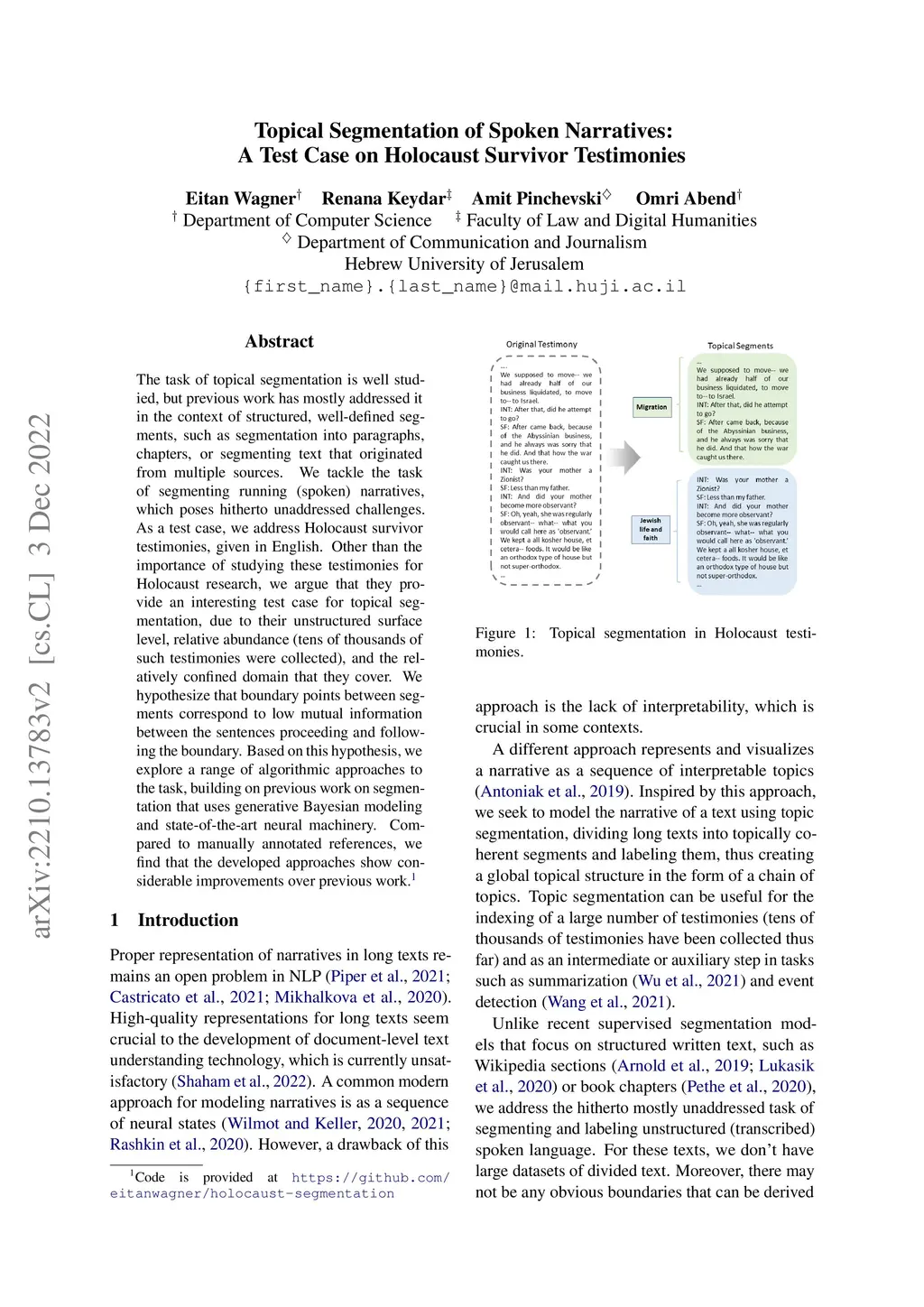 Topical Segmentation of Spoken Narratives: A Test Case on Holocaust