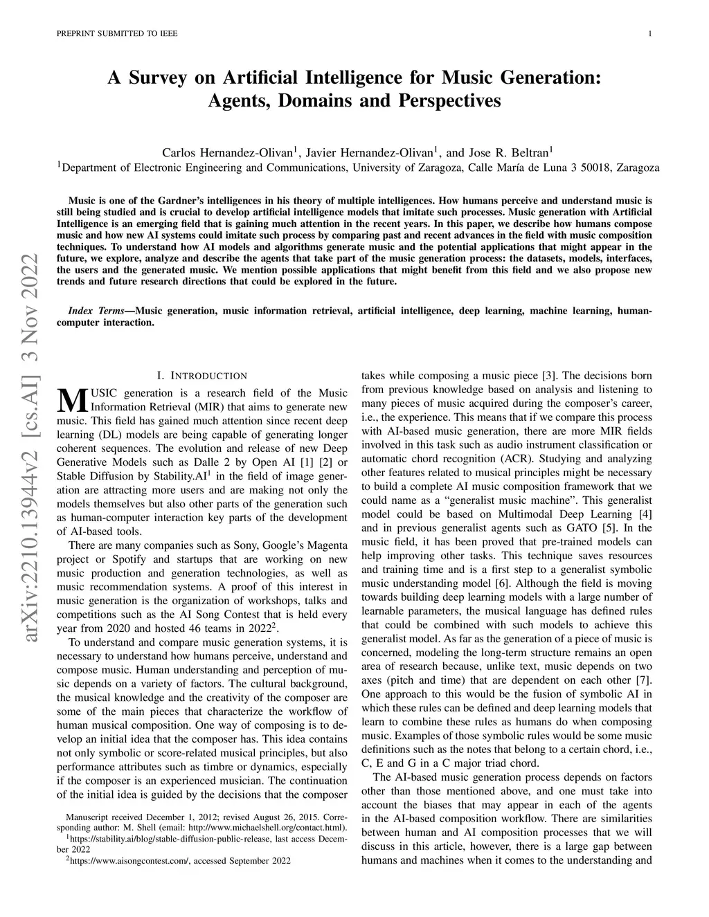 Music is one of the Gardner's intelligences in his theory of multiple intelligences. How humans perceive and understand music is still being studied and is crucial to develop artificial intelligence models that imitate such processes. Music generation with Artificial Intelligence is an emerging field that is gaining much attention in the recent years. In this paper, we describe how humans compose music and how new AI systems could imitate such process by comparing past and recent advances in the field with music composition techniques. To understand how AI models and algorithms generate music and the potential applications that might appear in the future, we explore, analyze and describe the agents that take part of the music generation process: the datasets, models, interfaces, the users and the generated music. We mention possible applications that might benefit from this field and we also propose new trends and future research directions that could be explored in the future.
