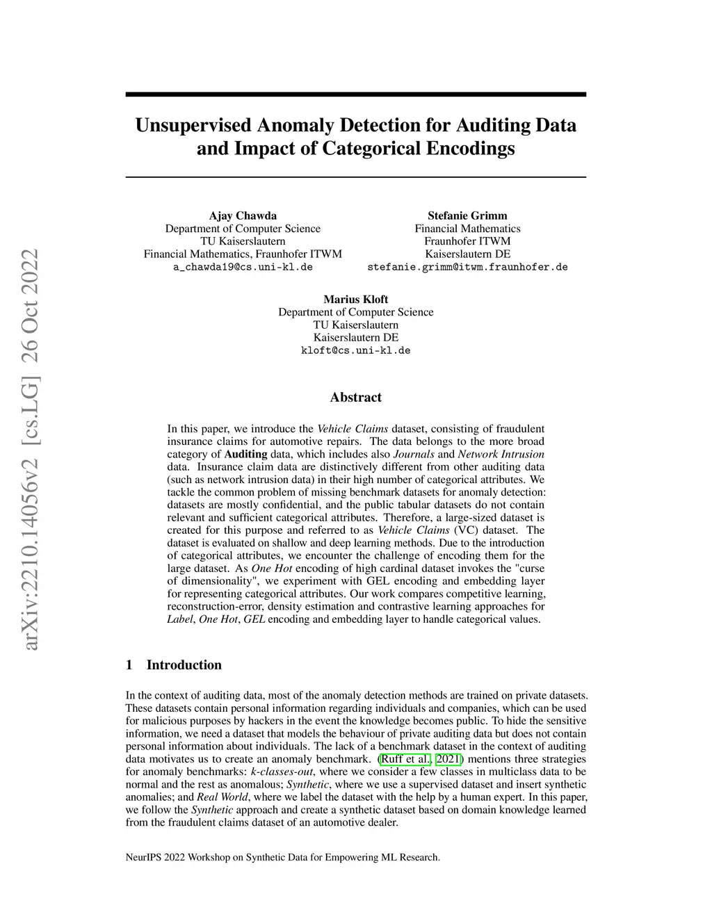 In this paper, we introduce the Vehicle Claims dataset, consisting of fraudulent insurance claims for automotive repairs. The data belongs to the more broad category of Auditing data, which includes also Journals and Network Intrusion data. Insurance claim data are distinctively different from other auditing data (such as network intrusion data) in their high number of categorical attributes. We tackle the common problem of missing benchmark datasets for anomaly detection: datasets are mostly confidential, and the public tabular datasets do not contain relevant and sufficient categorical attributes. Therefore, a large-sized dataset is created for this purpose and referred to as Vehicle Claims (VC) dataset. The dataset is evaluated on shallow and deep learning methods. Due to the introduction of categorical attributes, we encounter the challenge of encoding them for the large dataset. As One Hot encoding of high cardinal dataset invokes the "curse of dimensionality", we experiment with GEL encoding and embedding layer for representing categorical attributes. Our work compares competitive learning, reconstruction-error, density estimation and contrastive learning approaches for Label, One Hot, GEL encoding and embedding layer to handle categorical values.