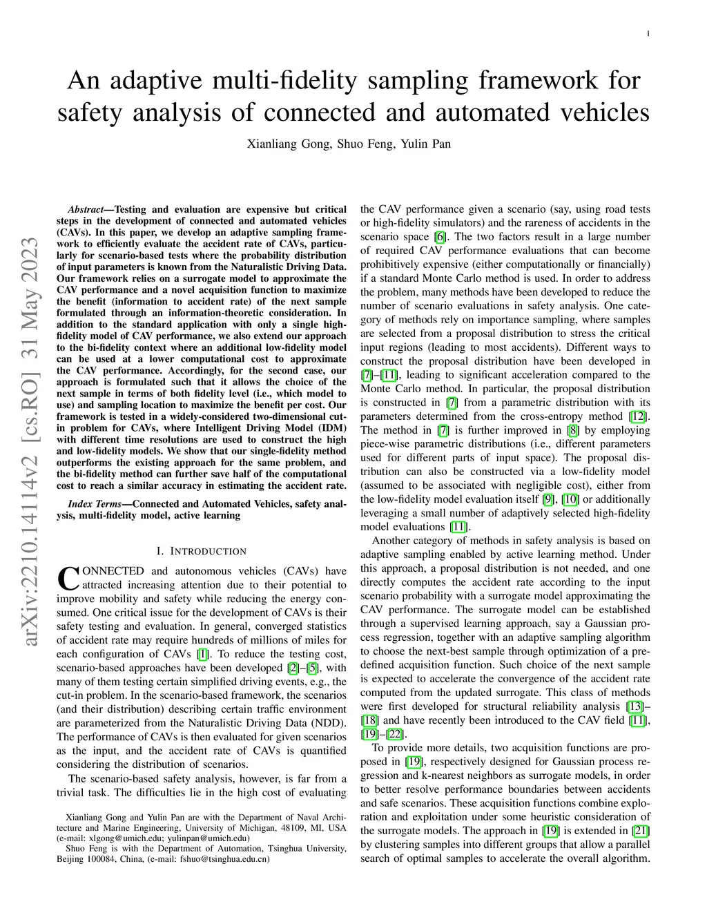 Testing and evaluation are expensive but critical steps in the development of connected and automated vehicles (CAVs). In this paper, we develop an adaptive sampling framework to efficiently evaluate the accident rate of CAVs, particularly for scenario-based tests where the probability distribution of input parameters is known from the Naturalistic Driving Data. Our framework relies on a surrogate model to approximate the CAV performance and a novel acquisition function to maximize the benefit (information to accident rate) of the next sample formulated through an information-theoretic consideration. In addition to the standard application with only a single high-fidelity model of CAV performance, we also extend our approach to the bi-fidelity context where an additional low-fidelity model can be used at a lower computational cost to approximate the CAV performance. Accordingly, for the second case, our approach is formulated such that it allows the choice of the next sample in terms of both fidelity level (i.e., which model to use) and sampling location to maximize the benefit per cost. Our framework is tested in a widely-considered two-dimensional cut-in problem for CAVs, where Intelligent Driving Model (IDM) with different time resolutions are used to construct the high and low-fidelity models. We show that our single-fidelity method outperforms the existing approach for the same problem, and the bi-fidelity method can further save half of the computational cost to reach a similar accuracy in estimating the accident rate.
