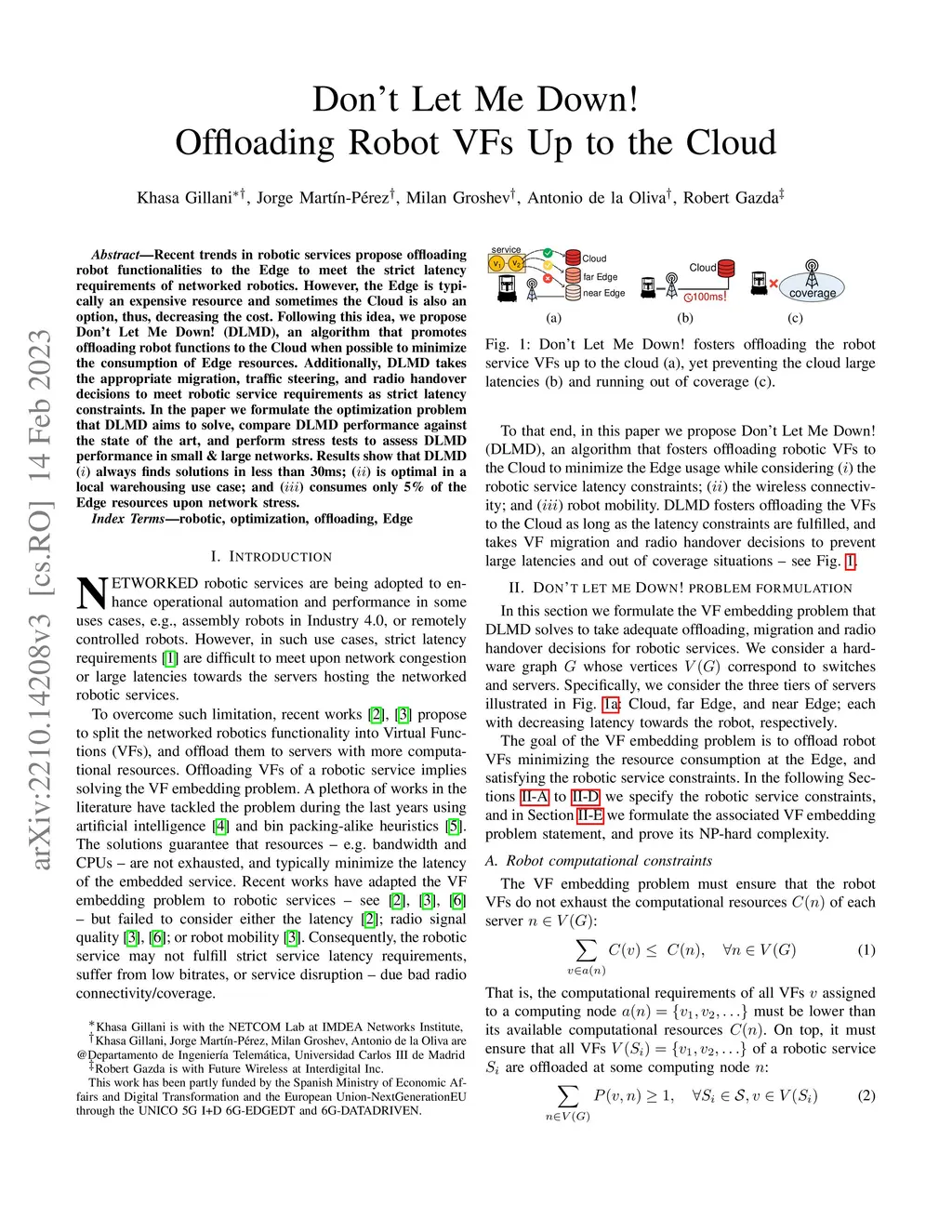 Recent trends in robotic services propose offloading robot functionalities to the Edge to meet the strict latency requirements of networked robotics. However, the Edge is typically an expensive resource and sometimes the Cloud is also an option, thus, decreasing the cost. Following this idea, we propose Don't Let Me Down! (DLMD), an algorithm that promotes offloading robot functions to the Cloud when possible to minimize the consumption of Edge resources. Additionally, DLMD takes the appropriate migration, traffic steering, and radio handover decisions to meet robotic service requirements as strict latency constraints. In the paper, we formulate the optimization problem that DLMD aims to solve, compare DLMD performance against state of art, and perform stress tests to assess DLMD performance in small & large networks. Results show that DLMD (i) always finds solutions in less than 30ms; (ii) is optimal in a local warehousing use case, and (iii) consumes only 5% of the Edge resources upon network stress.