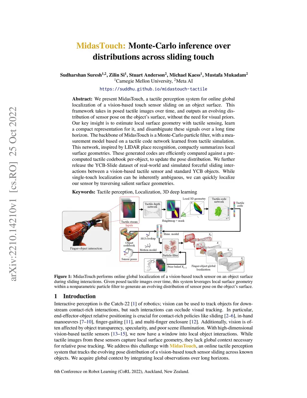 We present MidasTouch, a tactile perception system for online global localization of a vision-based touch sensor sliding on an object surface. This framework takes in posed tactile images over time, and outputs an evolving distribution of sensor pose on the object's surface, without the need for visual priors. Our key insight is to estimate local surface geometry with tactile sensing, learn a compact representation for it, and disambiguate these signals over a long time horizon. The backbone of MidasTouch is a Monte-Carlo particle filter, with a measurement model based on a tactile code network learned from tactile simulation. This network, inspired by LIDAR place recognition, compactly summarizes local surface geometries. These generated codes are efficiently compared against a precomputed tactile codebook per-object, to update the pose distribution. We further release the YCB-Slide dataset of real-world and simulated forceful sliding interactions between a vision-based tactile sensor and standard YCB objects. While single-touch localization can be inherently ambiguous, we can quickly localize our sensor by traversing salient surface geometries. Project page: https://suddhu.github.io/midastouch-tactile/