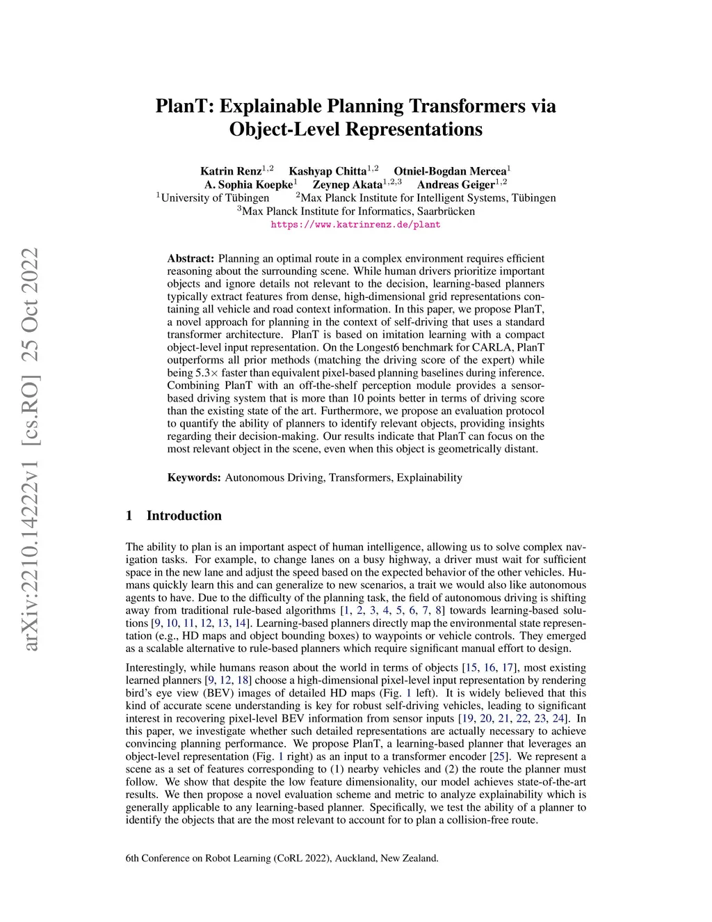 Planning an optimal route in a complex environment requires efficient reasoning about the surrounding scene. While human drivers prioritize important objects and ignore details not relevant to the decision, learning-based planners typically extract features from dense, high-dimensional grid representations containing all vehicle and road context information. In this paper, we propose PlanT, a novel approach for planning in the context of self-driving that uses a standard transformer architecture. PlanT is based on imitation learning with a compact object-level input representation. On the Longest6 benchmark for CARLA, PlanT outperforms all prior methods (matching the driving score of the expert) while being 5.3x faster than equivalent pixel-based planning baselines during inference. Combining PlanT with an off-the-shelf perception module provides a sensor-based driving system that is more than 10 points better in terms of driving score than the existing state of the art. Furthermore, we propose an evaluation protocol to quantify the ability of planners to identify relevant objects, providing insights regarding their decision-making. Our results indicate that PlanT can focus on the most relevant object in the scene, even when this object is geometrically distant.