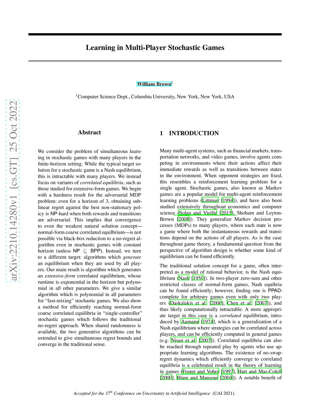 We consider the problem of simultaneous learning in stochastic games with many players in the finite-horizon setting. While the typical target solution for a stochastic game is a Nash equilibrium, this is intractable with many players. We instead focus on variants of {\it correlated equilibria}, such as those studied for extensive-form games. We begin with a hardness result for the adversarial MDP problem: even for a horizon of 3, obtaining sublinear regret against the best non-stationary policy is \textsf{NP}-hard when both rewards and transitions are adversarial. This implies that convergence to even the weakest natural solution concept -- normal-form coarse correlated equilbrium -- is not possible via black-box reduction to a no-regret algorithm even in stochastic games with constant horizon (unless ). Instead, we turn to a different target: algorithms which {\it generate} an equilibrium when they are used by all players. Our main result is algorithm which generates an {\it extensive-form} correlated equilibrium, whose runtime is exponential in the horizon but polynomial in all other parameters. We give a similar algorithm which is polynomial in all parameters for "fast-mixing" stochastic games. We also show a method for efficiently reaching normal-form coarse correlated equilibria in "single-controller" stochastic games which follows the traditional no-regret approach. When shared randomness is available, the two generative algorithms can be extended to give simultaneous regret bounds and converge in the traditional sense.