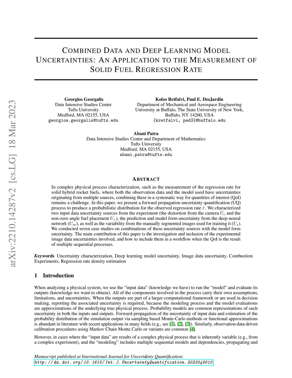 In complex physical process characterization, such as the measurement of the regression rate for solid hybrid rocket fuels, where both the observation data and the model used have uncertainties originating from multiple sources, combining these in a systematic way for quantities of interest(QoI) remains a challenge. In this paper, we present a forward propagation uncertainty quantification (UQ) process to produce a probabilistic distribution for the observed regression rate . We characterized two input data uncertainty sources from the experiment (the distortion from the camera and the non-zero angle fuel placement ), the prediction and model form uncertainty from the deep neural network (), as well as the variability from the manually segmented images used for training it (). We conducted seven case studies on combinations of these uncertainty sources with the model form uncertainty. The main contribution of this paper is the investigation and inclusion of the experimental image data uncertainties involved, and how to include them in a workflow when the QoI is the result of multiple sequential processes.