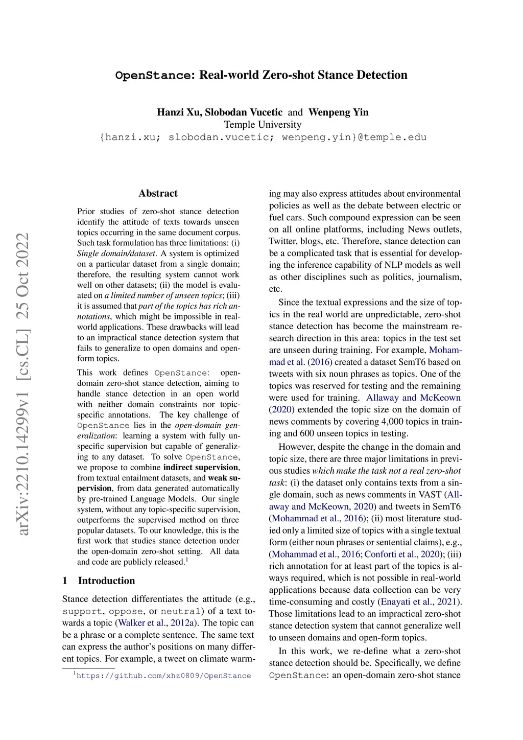 Prior studies of zero-shot stance detection identify the attitude of texts towards unseen topics occurring in the same document corpus. Such task formulation has three limitations: (i) Single domain/dataset. A system is optimized on a particular dataset from a single domain; therefore, the resulting system cannot work well on other datasets; (ii) the model is evaluated on a limited number of unseen topics; (iii) it is assumed that part of the topics has rich annotations, which might be impossible in real-world applications. These drawbacks will lead to an impractical stance detection system that fails to generalize to open domains and open-form topics. This work defines OpenStance: open-domain zero-shot stance detection, aiming to handle stance detection in an open world with neither domain constraints nor topic-specific annotations. The key challenge of OpenStance lies in the open-domain generalization: learning a system with fully unspecific supervision but capable of generalizing to any dataset. To solve OpenStance, we propose to combine indirect supervision, from textual entailment datasets, and weak supervision, from data generated automatically by pre-trained Language Models. Our single system, without any topic-specific supervision, outperforms the supervised method on three popular datasets. To our knowledge, this is the first work that studies stance detection under the open-domain zero-shot setting. All data and code are publicly released.