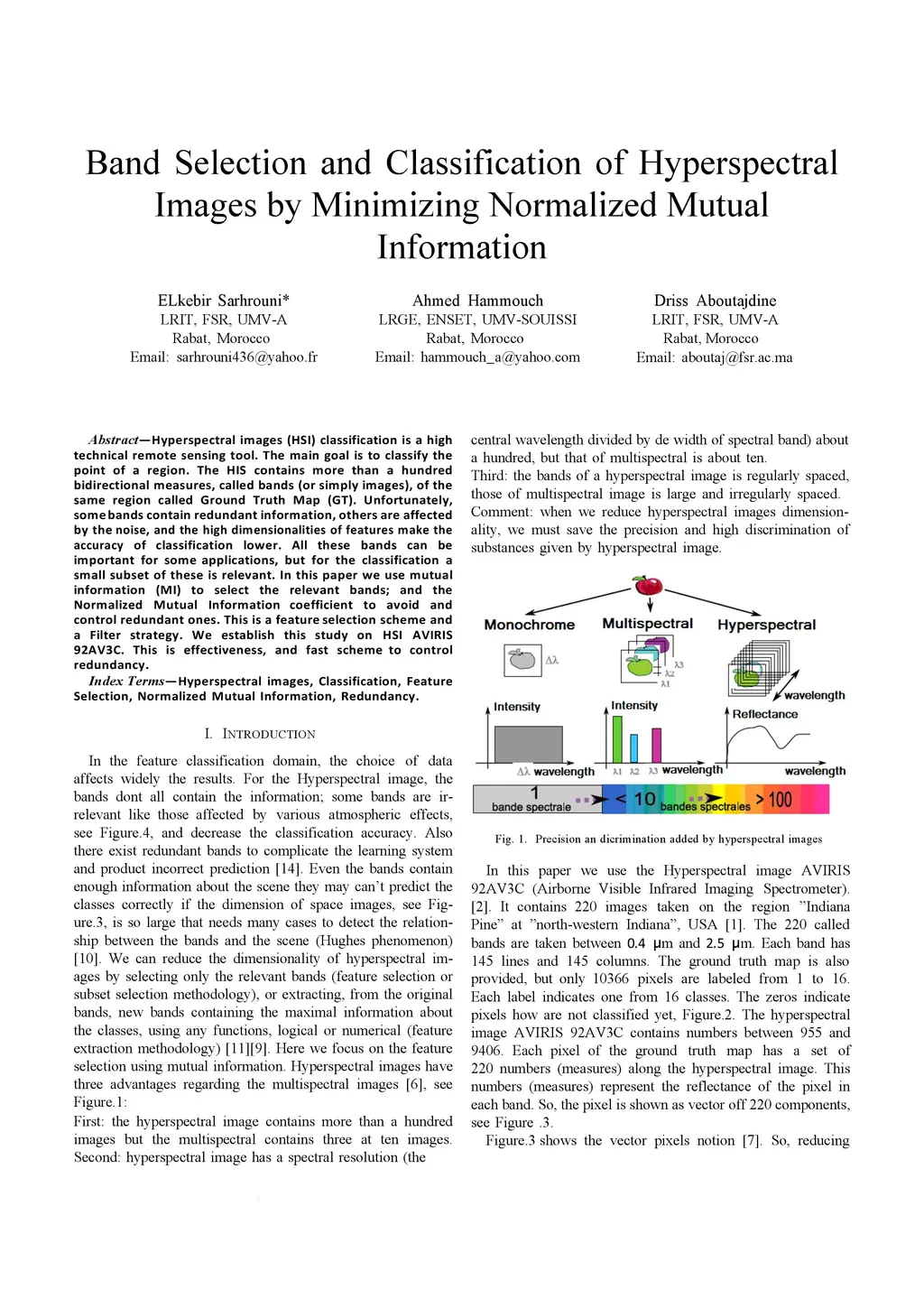 Hyperspectral images (HSI) classification is a high technical remote sensing tool. The main goal is to classify the point of a region. The HIS contains more than a hundred bidirectional measures, called bands (or simply images), of the same region called Ground Truth Map (GT). Unfortunately, some bands contain redundant information, others are affected by the noise, and the high dimensionalities of features make the accuracy of classification lower. All these bands can be important for some applications, but for the classification a small subset of these is relevant. In this paper we use mutual information (MI) to select the relevant bands; and the Normalized Mutual Information coefficient to avoid and control redundant ones. This is a feature selection scheme and a Filter strategy. We establish this study on HSI AVIRIS 92AV3C. This is effectiveness, and fast scheme to control redundancy. Index Terms: Hyperspectral images, Classification, Feature Selection, Normalized Mutual Information, Redundancy.