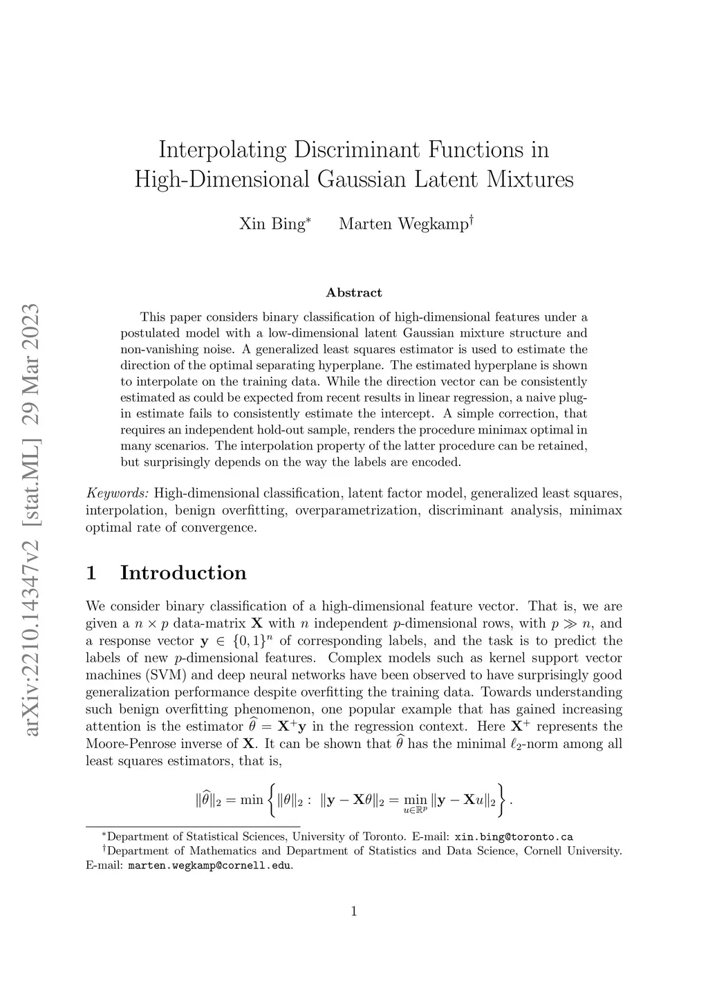 This paper considers binary classification of high-dimensional features under a postulated model with a low-dimensional latent Gaussian mixture structure and non-vanishing noise. A generalized least squares estimator is used to estimate the direction of the optimal separating hyperplane. The estimated hyperplane is shown to interpolate on the training data. While the direction vector can be consistently estimated as could be expected from recent results in linear regression, a naive plug-in estimate fails to consistently estimate the intercept. A simple correction, that requires an independent hold-out sample, renders the procedure minimax optimal in many scenarios. The interpolation property of the latter procedure can be retained, but surprisingly depends on the way the labels are encoded.