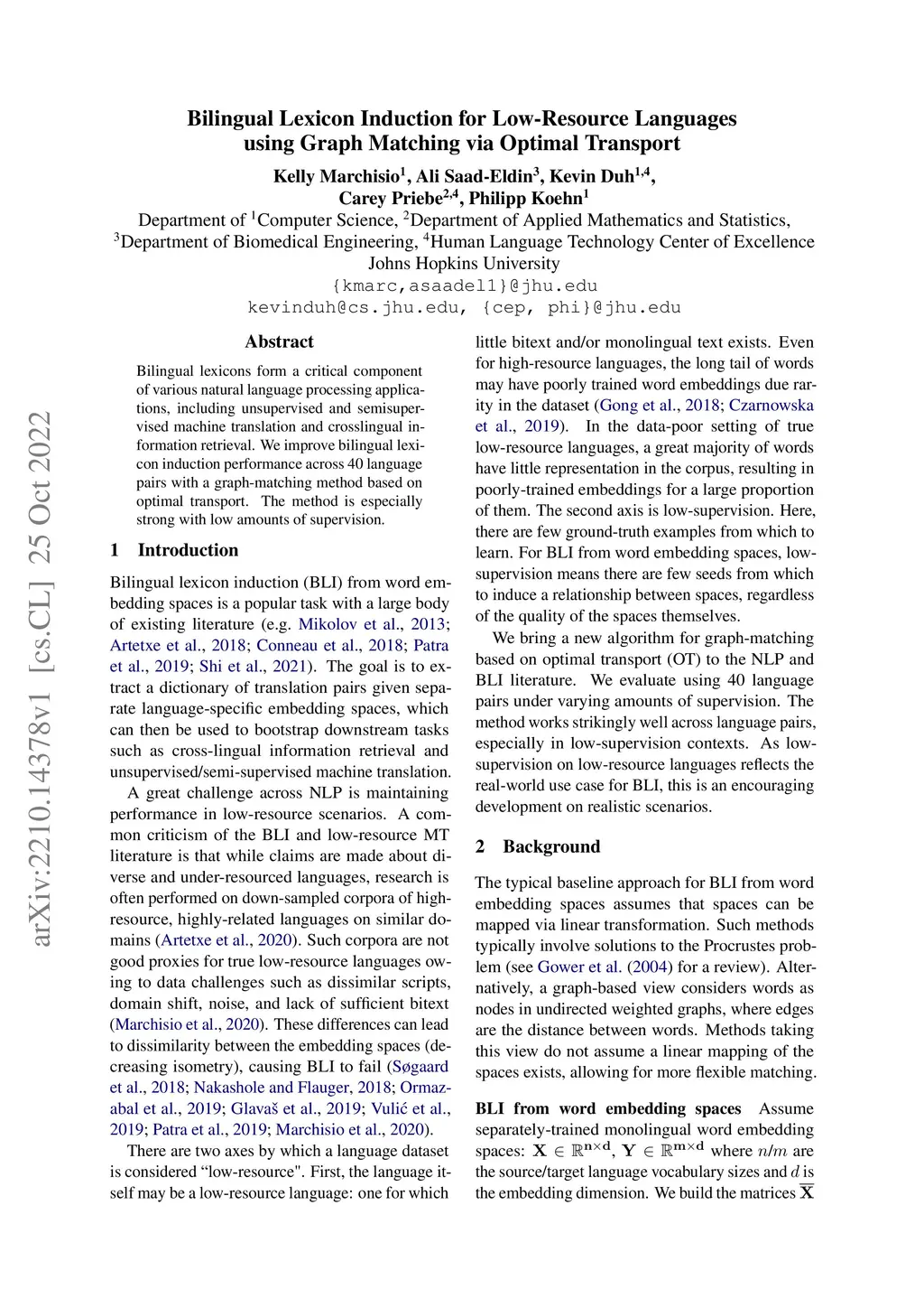 Bilingual lexicons form a critical component of various natural language processing applications, including unsupervised and semisupervised machine translation and crosslingual information retrieval. We improve bilingual lexicon induction performance across 40 language pairs with a graph-matching method based on optimal transport. The method is especially strong with low amounts of supervision.