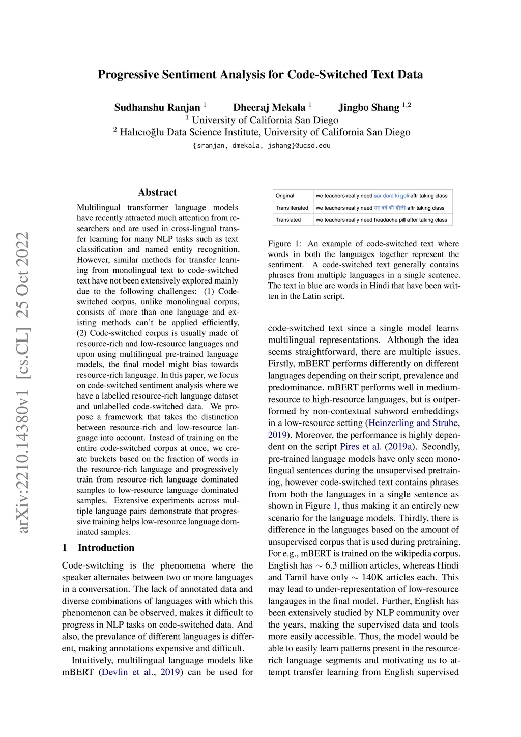 Progressive Sentiment Analysis for Code-Switched Text Data