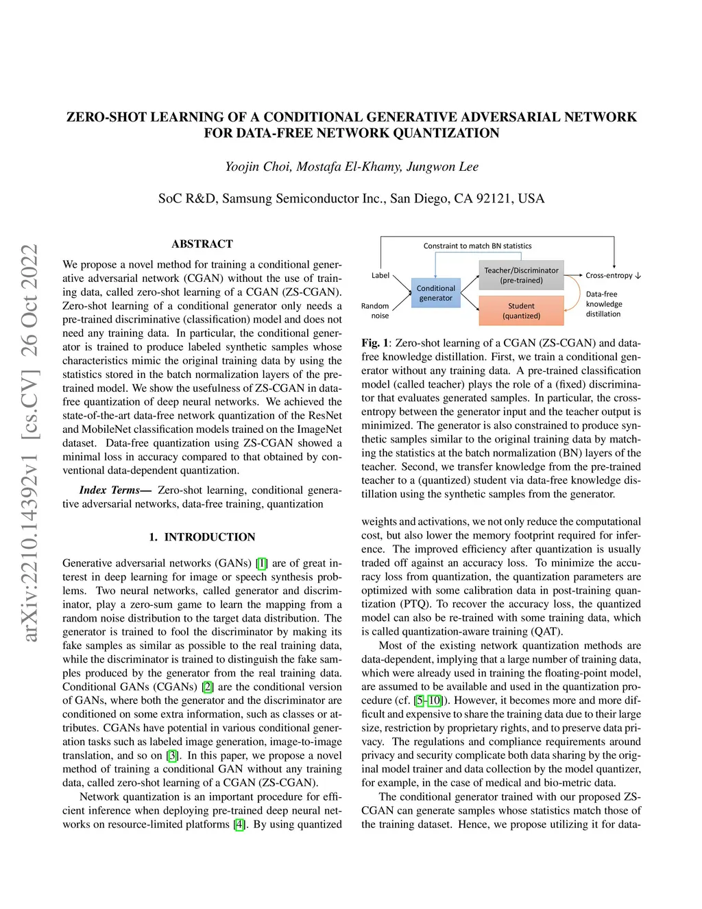 We propose a novel method for training a conditional generative adversarial network (CGAN) without the use of training data, called zero-shot learning of a CGAN (ZS-CGAN). Zero-shot learning of a conditional generator only needs a pre-trained discriminative (classification) model and does not need any training data. In particular, the conditional generator is trained to produce labeled synthetic samples whose characteristics mimic the original training data by using the statistics stored in the batch normalization layers of the pre-trained model. We show the usefulness of ZS-CGAN in data-free quantization of deep neural networks. We achieved the state-of-the-art data-free network quantization of the ResNet and MobileNet classification models trained on the ImageNet dataset. Data-free quantization using ZS-CGAN showed a minimal loss in accuracy compared to that obtained by conventional data-dependent quantization.