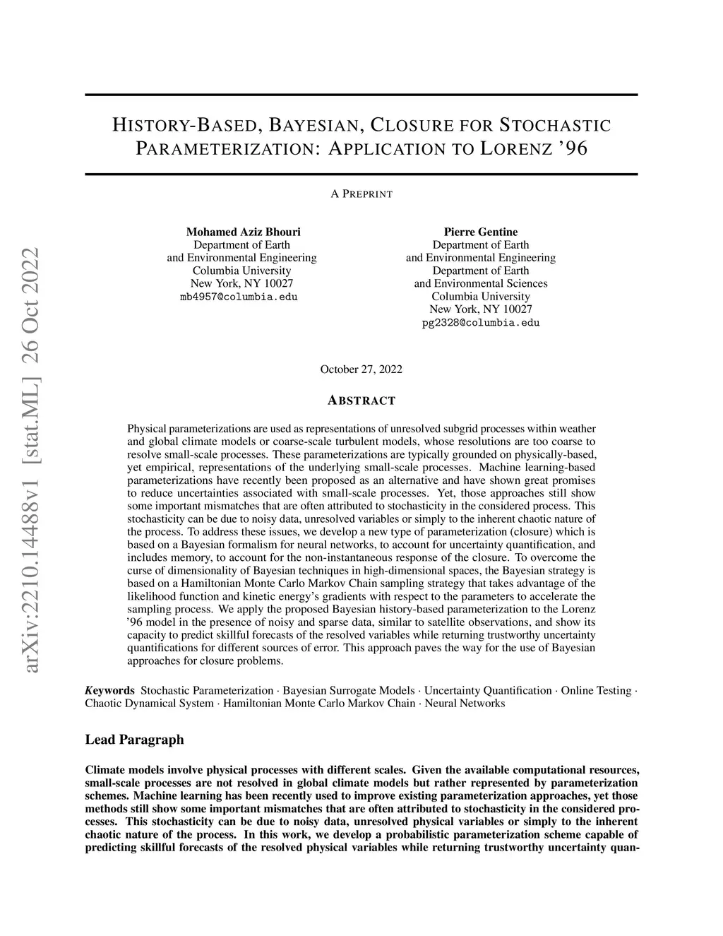 History-Based, Bayesian, Closure for Stochastic Parameterization: