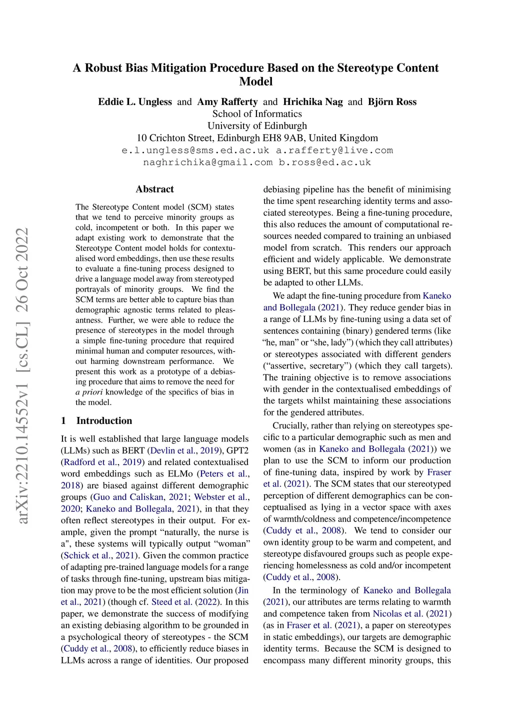 The Stereotype Content model (SCM) states that we tend to perceive minority groups as cold, incompetent or both. In this paper we adapt existing work to demonstrate that the Stereotype Content model holds for contextualised word embeddings, then use these results to evaluate a fine-tuning process designed to drive a language model away from stereotyped portrayals of minority groups. We find the SCM terms are better able to capture bias than demographic agnostic terms related to pleasantness. Further, we were able to reduce the presence of stereotypes in the model through a simple fine-tuning procedure that required minimal human and computer resources, without harming downstream performance. We present this work as a prototype of a debiasing procedure that aims to remove the need for a priori knowledge of the specifics of bias in the model.