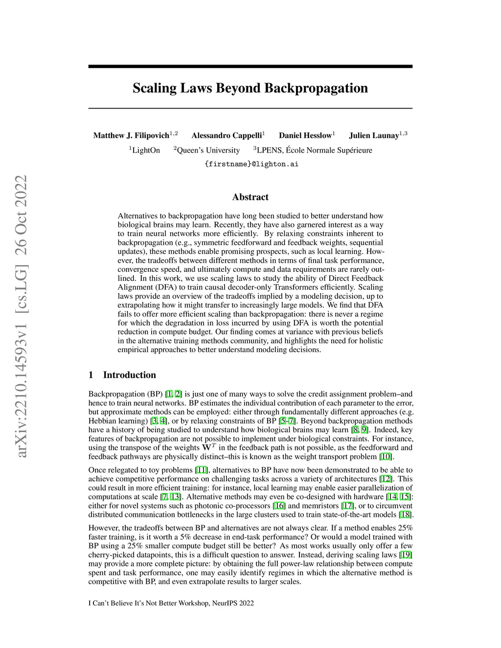 Alternatives to backpropagation have long been studied to better understand how biological brains may learn. Recently, they have also garnered interest as a way to train neural networks more efficiently. By relaxing constraints inherent to backpropagation (e.g., symmetric feedforward and feedback weights, sequential updates), these methods enable promising prospects, such as local learning. However, the tradeoffs between different methods in terms of final task performance, convergence speed, and ultimately compute and data requirements are rarely outlined. In this work, we use scaling laws to study the ability of Direct Feedback Alignment~(DFA) to train causal decoder-only Transformers efficiently. Scaling laws provide an overview of the tradeoffs implied by a modeling decision, up to extrapolating how it might transfer to increasingly large models. We find that DFA fails to offer more efficient scaling than backpropagation: there is never a regime for which the degradation in loss incurred by using DFA is worth the potential reduction in compute budget. Our finding comes at variance with previous beliefs in the alternative training methods community, and highlights the need for holistic empirical approaches to better understand modeling decisions.