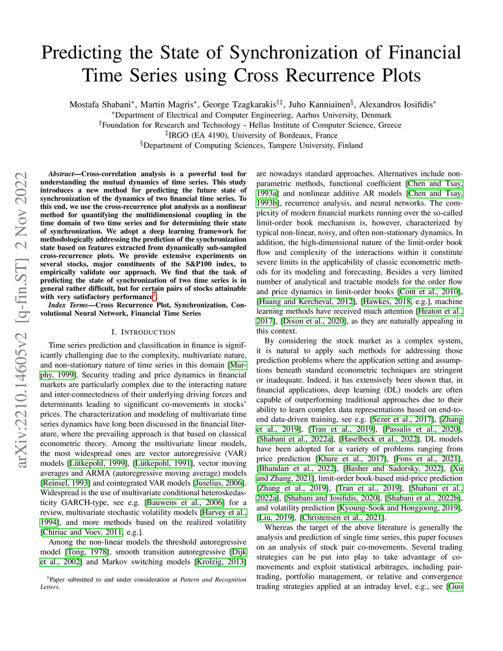 Cross-correlation analysis is a powerful tool for understanding the mutual dynamics of time series. This study introduces a new method for predicting the future state of synchronization of the dynamics of two financial time series. To this end, we use the cross-recurrence plot analysis as a nonlinear method for quantifying the multidimensional coupling in the time domain of two time series and for determining their state of synchronization. We adopt a deep learning framework for methodologically addressing the prediction of the synchronization state based on features extracted from dynamically sub-sampled cross-recurrence plots. We provide extensive experiments on several stocks, major constituents of the S\&P100 index, to empirically validate our approach. We find that the task of predicting the state of synchronization of two time series is in general rather difficult, but for certain pairs of stocks attainable with very satisfactory performance.