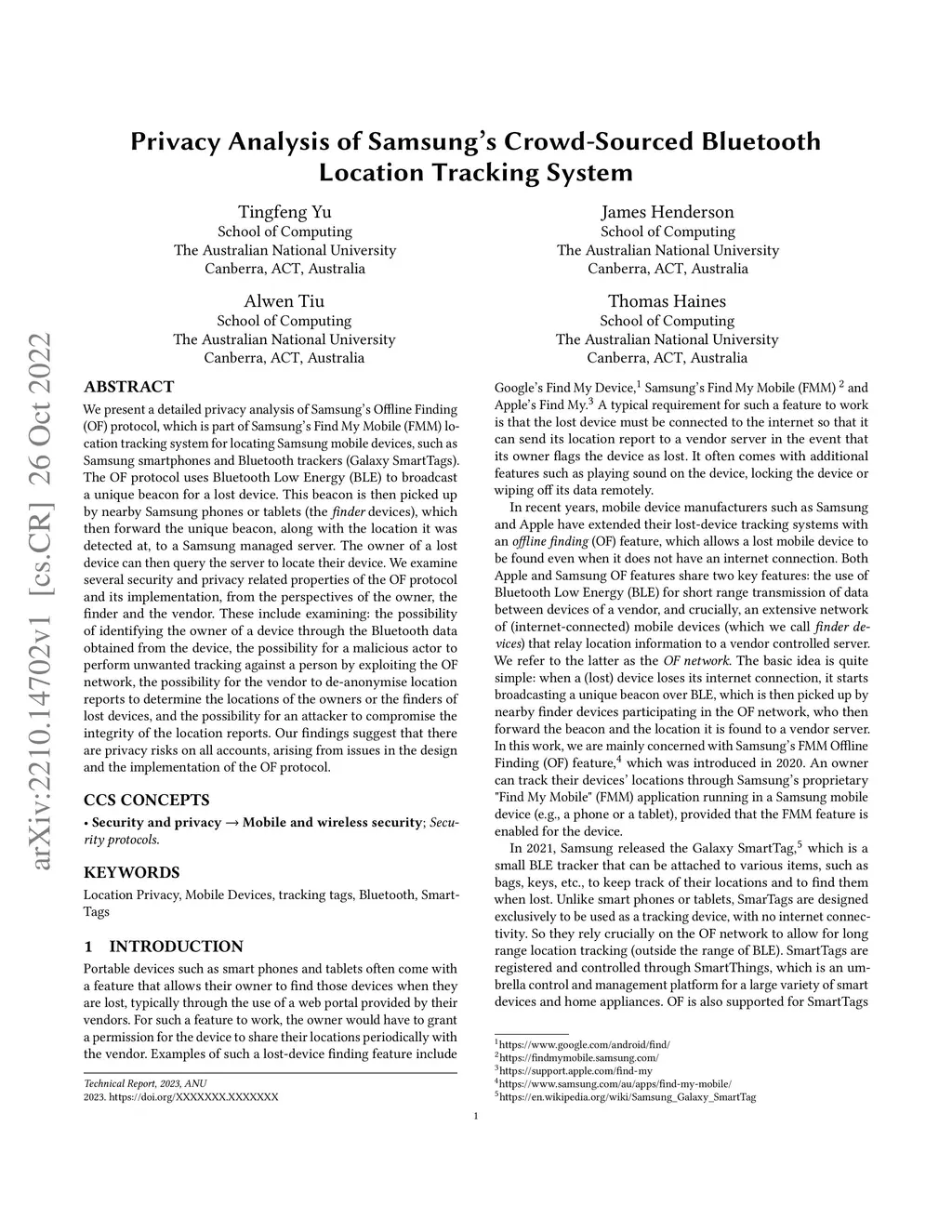 We present a detailed privacy analysis of Samsung's Offline Finding (OF) protocol, which is part of Samsung's Find My Mobile (FMM) location tracking system for locating Samsung mobile devices, such as Samsung smartphones and Bluetooth trackers (Galaxy SmartTags). The OF protocol uses Bluetooth Low Energy (BLE) to broadcast a unique beacon for a lost device. This beacon is then picked up by nearby Samsung phones or tablets (the {\em finder} devices), which then forward the unique beacon, along with the location it was detected at, to a Samsung managed server. The owner of a lost device can then query the server to locate their device. We examine several security and privacy related properties of the OF protocol and its implementation, from the perspectives of the owner, the finder and the vendor. These include examining: the possibility of identifying the owner of a device through the Bluetooth data obtained from the device, the possibility for a malicious actor to perform unwanted tracking against a person by exploiting the OF network, the possibility for the vendor to de-anonymise location reports to determine the locations of the owners or the finders of lost devices, and the possibility for an attacker to compromise the integrity of the location reports. Our findings suggest that there are privacy risks on all accounts, arising from issues in the design and the implementation of the OF protocol.
